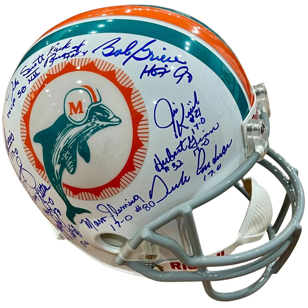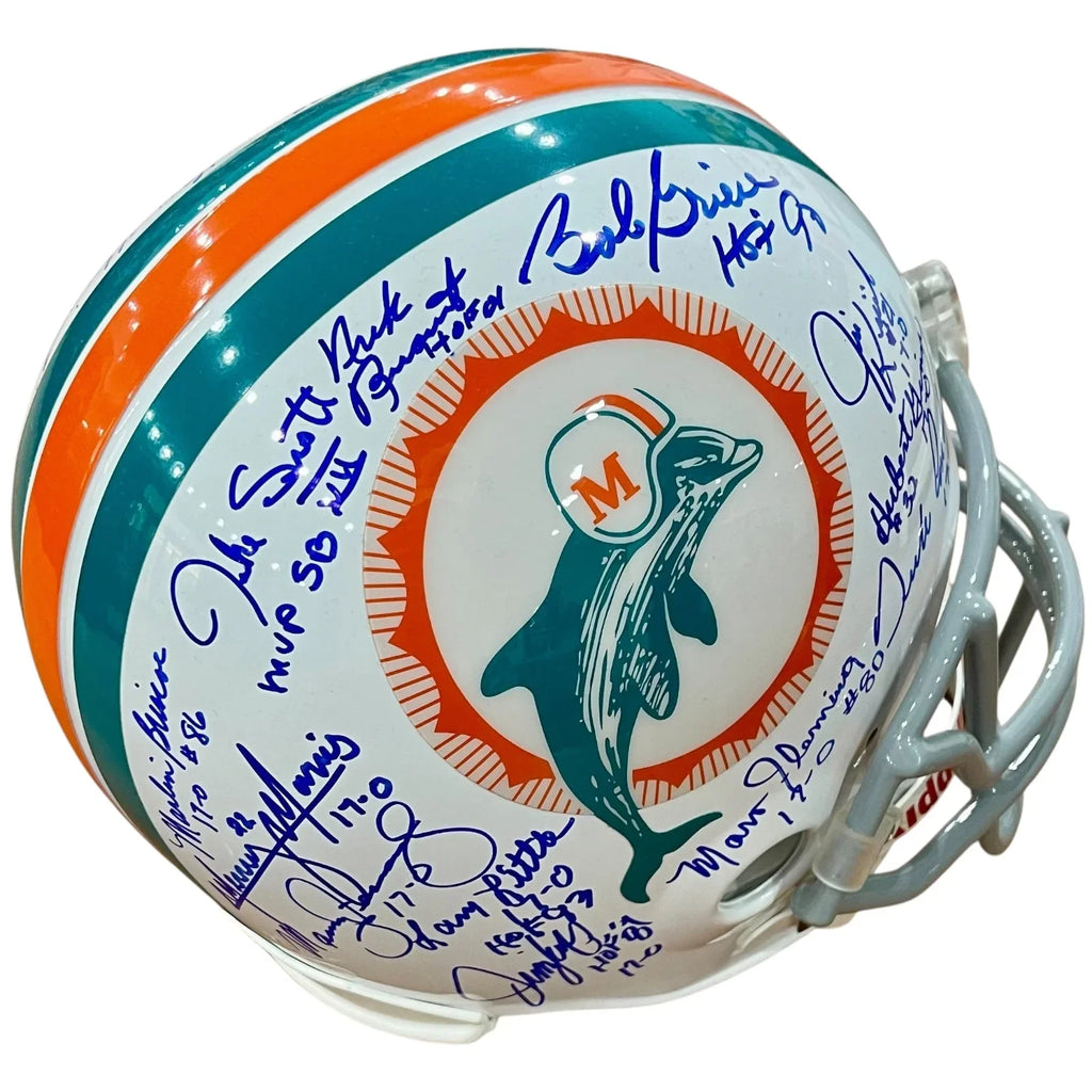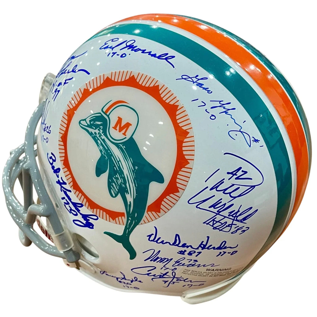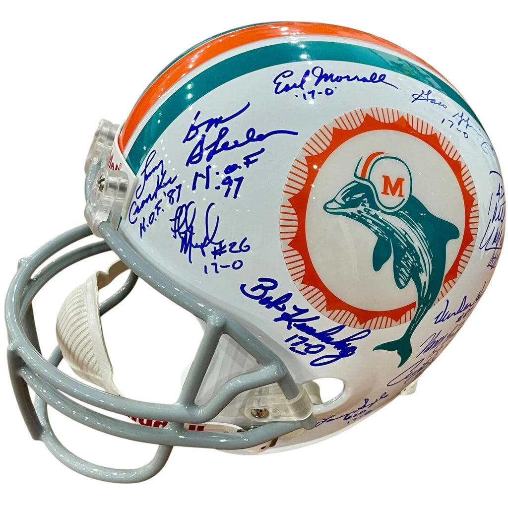 Celebrate the 1972 Miami Dolphins' perfect season with this deluxe full-size replica helmet! Signed by legendary coach Don Shula and 22 players, this throwback piece is a must-have for any fan. Display it proudly as a symbol of the team's historic achievement. Own a piece of history today!