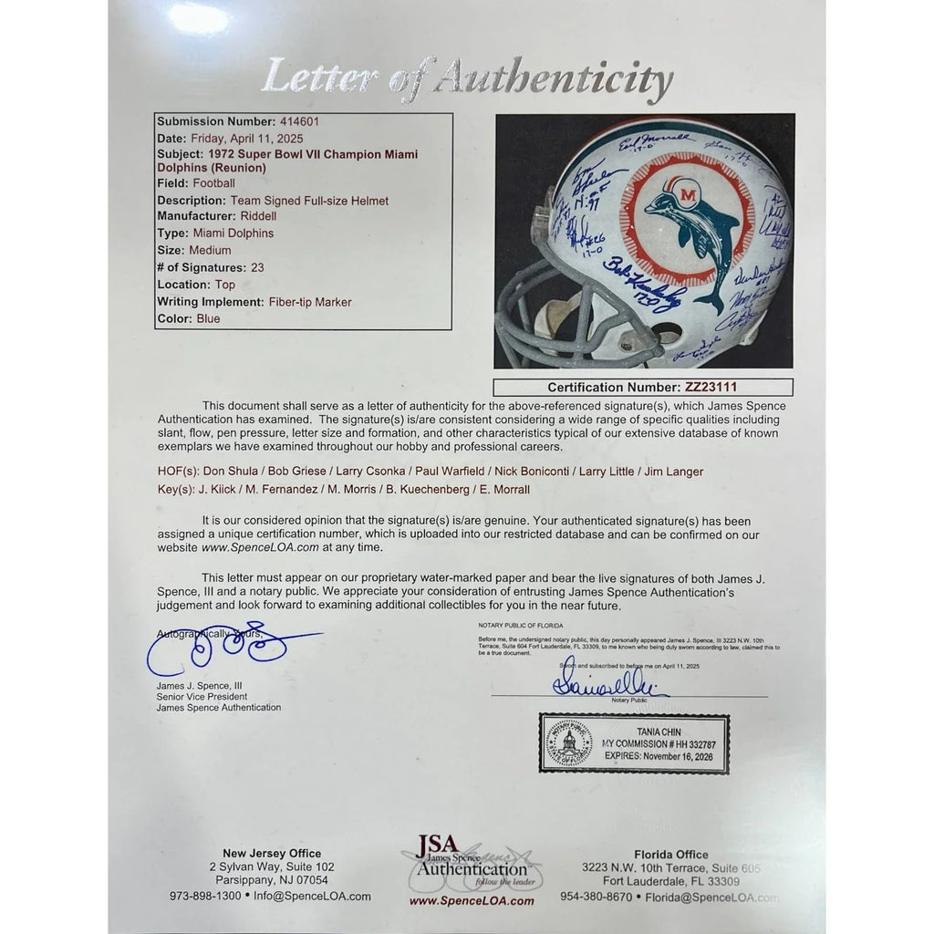 Signatures include: Coach Don Shula, Dick Anderson #40, Marlin Briscoe #86, Nick Buoniconti #85, LARRY CSONKA #39 (HOF), Vern Den Herder #83, Norm Evans #73, Manny Fernandez #75, Marv Fleming #80, Hubert Ginn #32, BOB GRIESE #12 (HOF), Curtis Johnson #45, JIM KIICK #21, BOB KUECHENBERG (HOF) #67, JIM LANGER #62 (HOF), LARRY LITTLE #66 (HOF), Earl Morrall #15, Lloyd Mumford #26, Mercury Morris #22, JAKE SCOTT #13 (MVP), Larry Seiple #20, PAUL WARFIELD #42 (HOF), and Gary Yepremian #1.