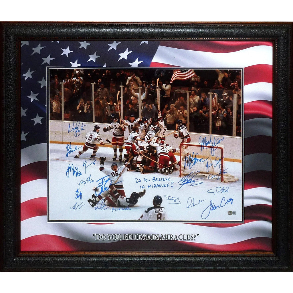 Own a piece of history with this deluxe framed 20x24 photo of the 1980 U.S. Olympic Hockey Team, signed by 18 team members. This iconic "Miracle On Ice" moment is captured in stunning detail, with an American flag matting adding patriotic flair. Includes a Beckett authentication for added value and peace of mind.