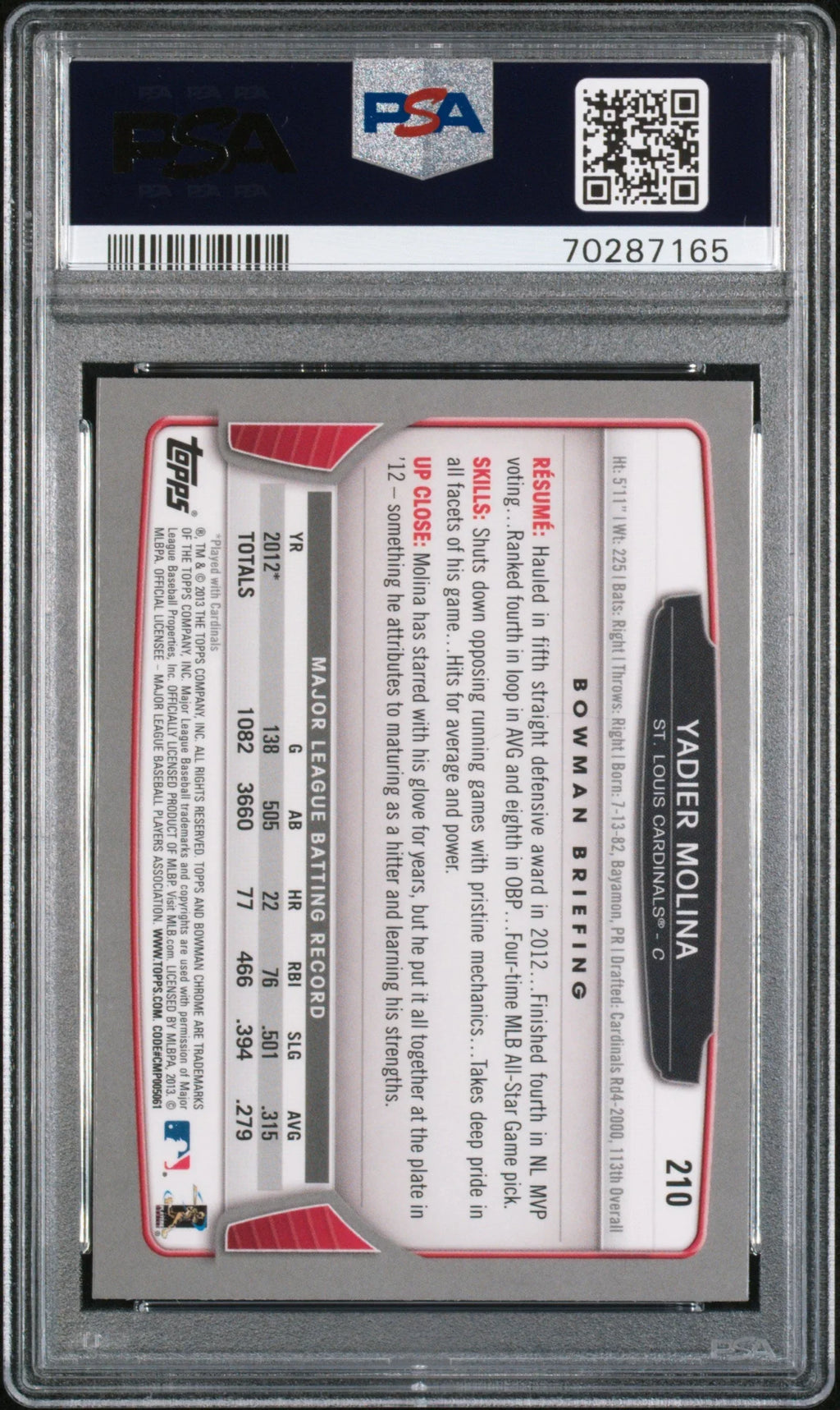 2013 BOWMAN CHROME YADIER MOLINA #210 - PSA 10