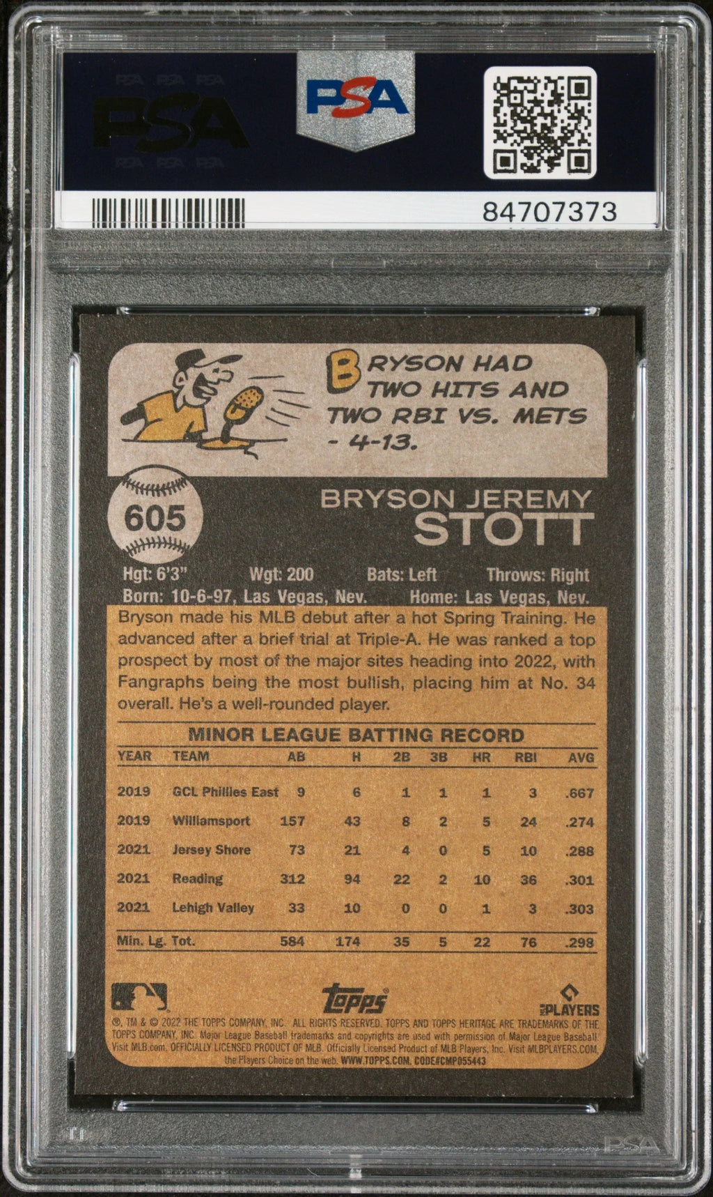 2022 TOPPS HERITAGE BRYSON STOTT #605 - PSA 10 ROOKIE CARD