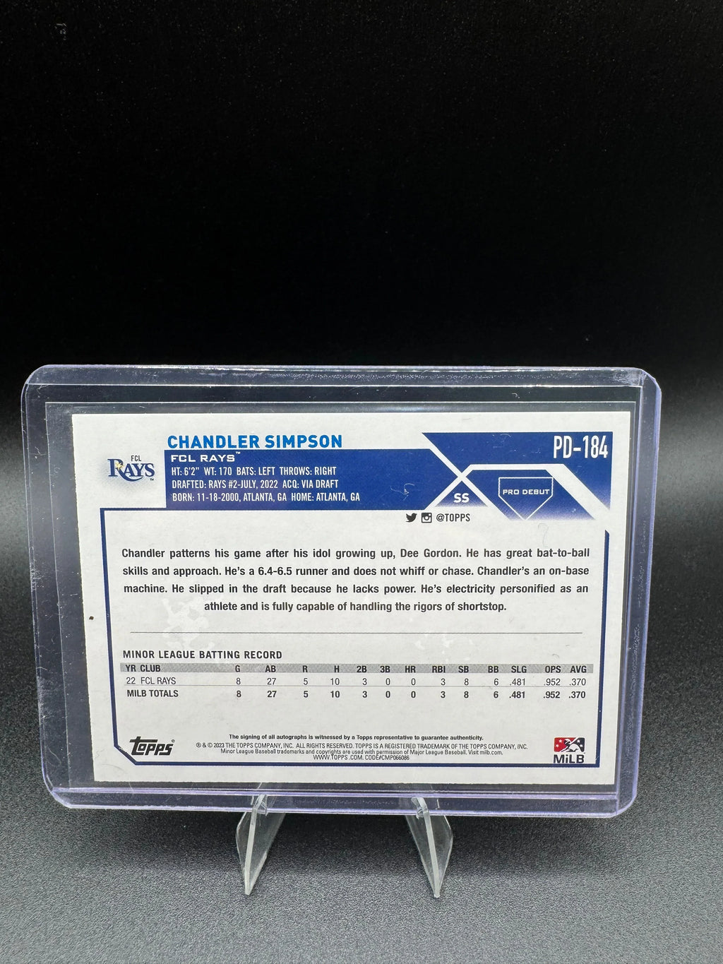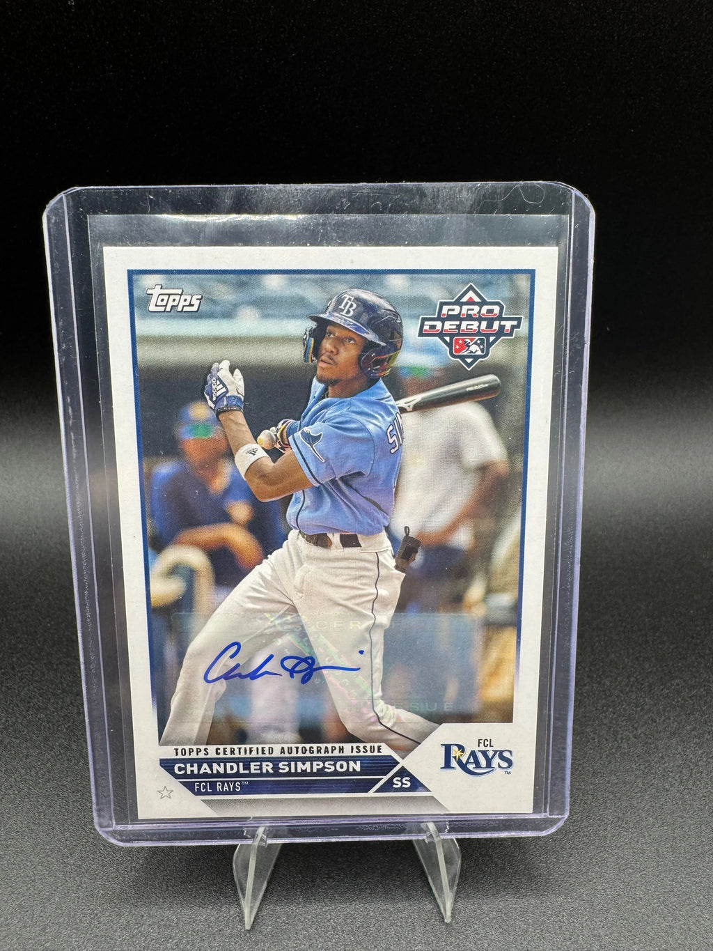 The 2023 Topps Pro Debut Chandler Simpson Autograph Rookie Card captures the promising talent of this Tampa Rays speedster in his debut season. Featuring a certified autograph, this card is a valuable addition for collectors seeking a rising star with authentic memorabilia. Its pristine design and rookie status highlight Simpson’s potential impact, making it a must-have for serious baseball enthusiasts and investors alike.