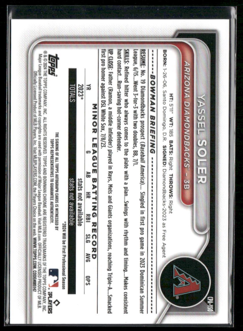 2024 Bowman Chrome #CPA-YSO Yassel Soler Prospects Autographs Yellow Refractors