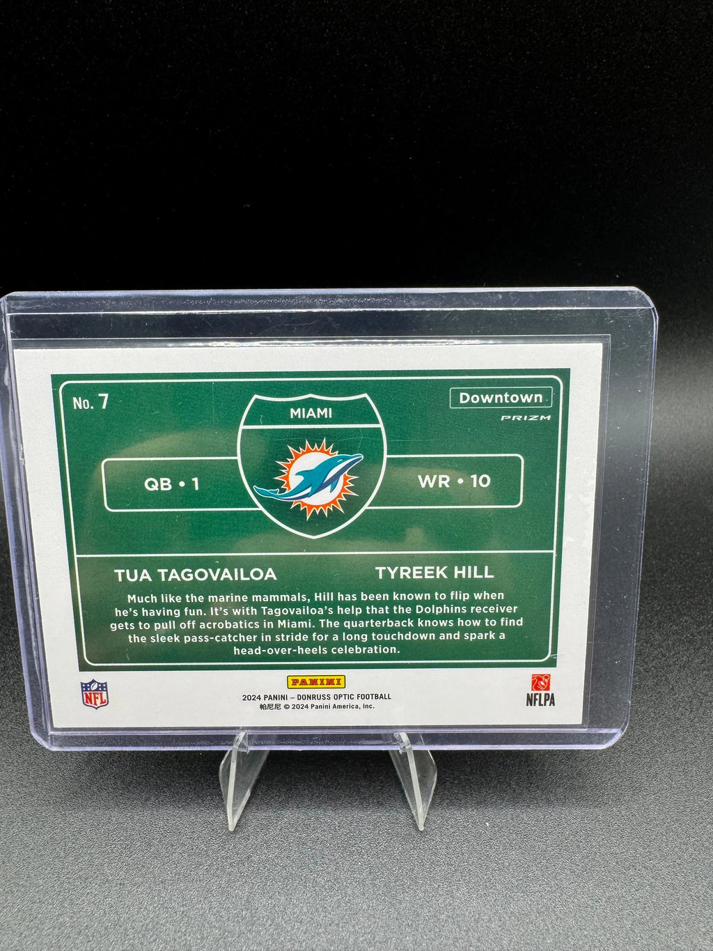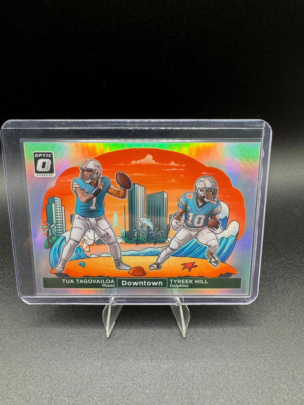 This 2024 Donruss Optic Dual Downtown card features an exclusive short print (SSP) pairing of Tyreek Hill and Tua Tagovailoa, both key players for the Miami Dolphins. A rare collectible prized by serious enthusiasts, this card highlights dynamic downtown artwork and offers a unique opportunity to own a limited edition piece showcasing two of the NFL’s most exciting talents. Ideal for advanced collectors seeking standout additions to their football card portfolio.