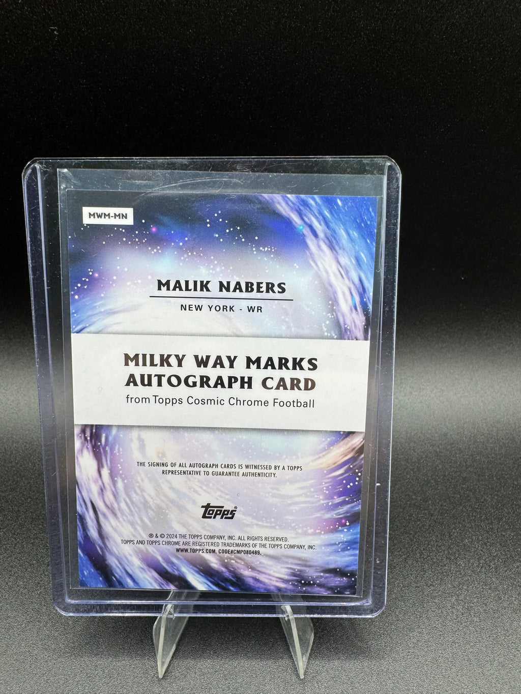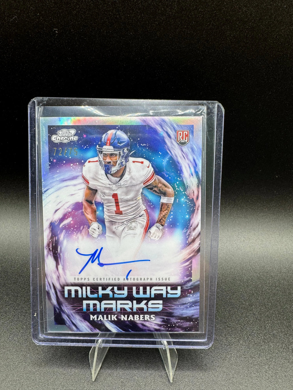 This 2024 Topps Cosmic Chrome Milky Way Marks Auto features a rare autograph of rising star Malik Nabers, numbered 72 of only 75 produced. As a coveted rookie card, it combines premium Topps Chrome quality with limited edition scarcity, making it a valuable addition for serious collectors and investors tracking emerging talent.