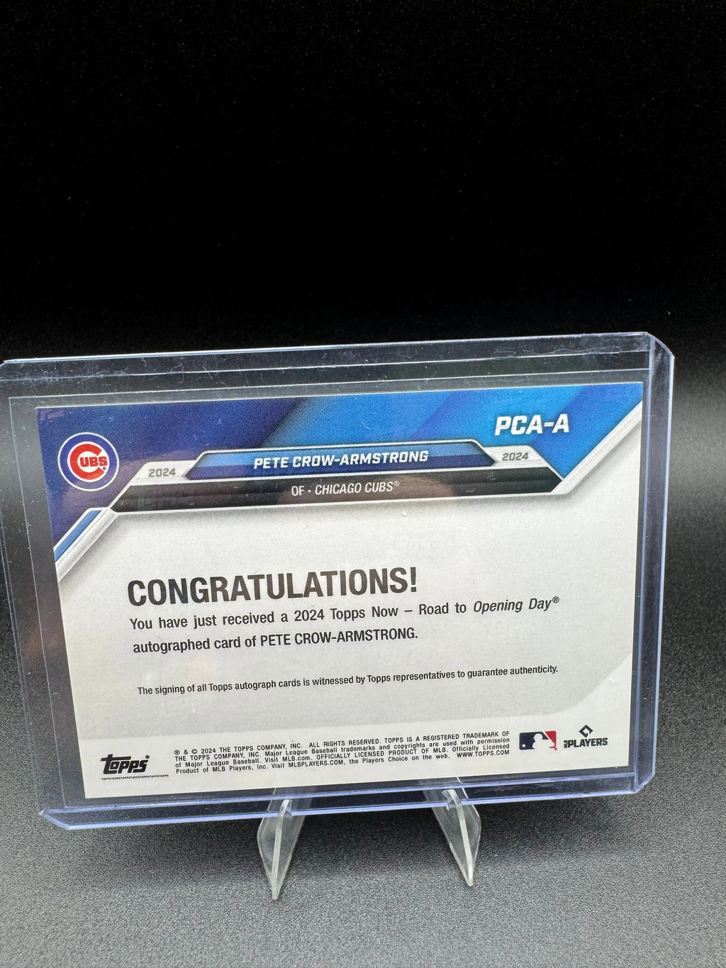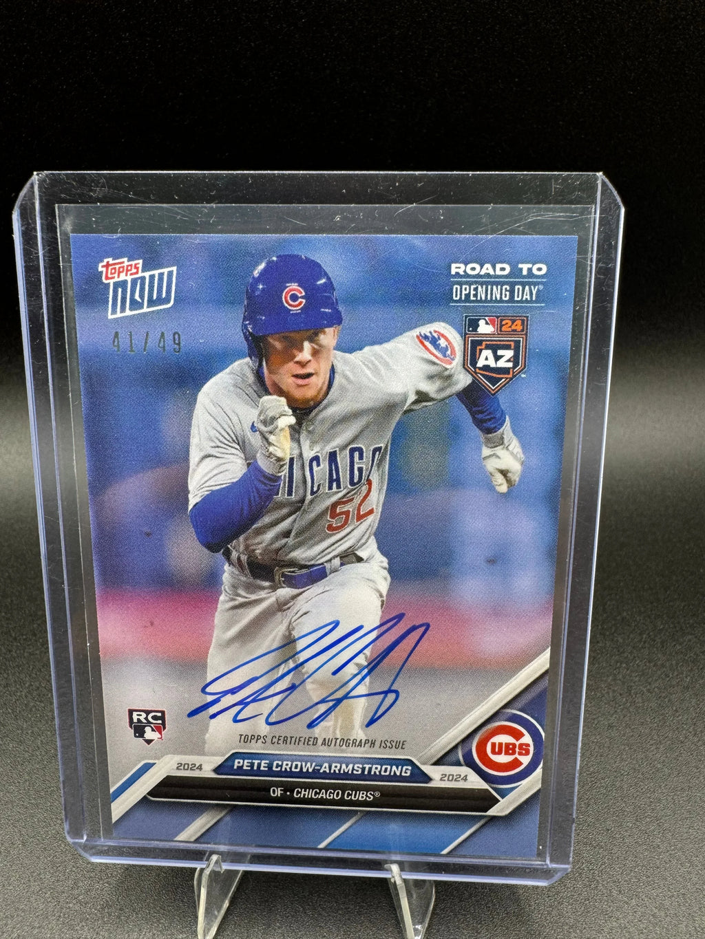 This 2024 Topps Now MLB Road To Opening Day Autograph #PCA-A features Pete Crow-Armstrong, a promising rookie making waves in the baseball world. Limited to just 49 copies, with this card numbered 41/49, it offers collectors a rare opportunity to own a piece of a rising star’s early career. The authentic autograph adds significant value, making it a must-have for serious enthusiasts and investors tracking emerging talent.