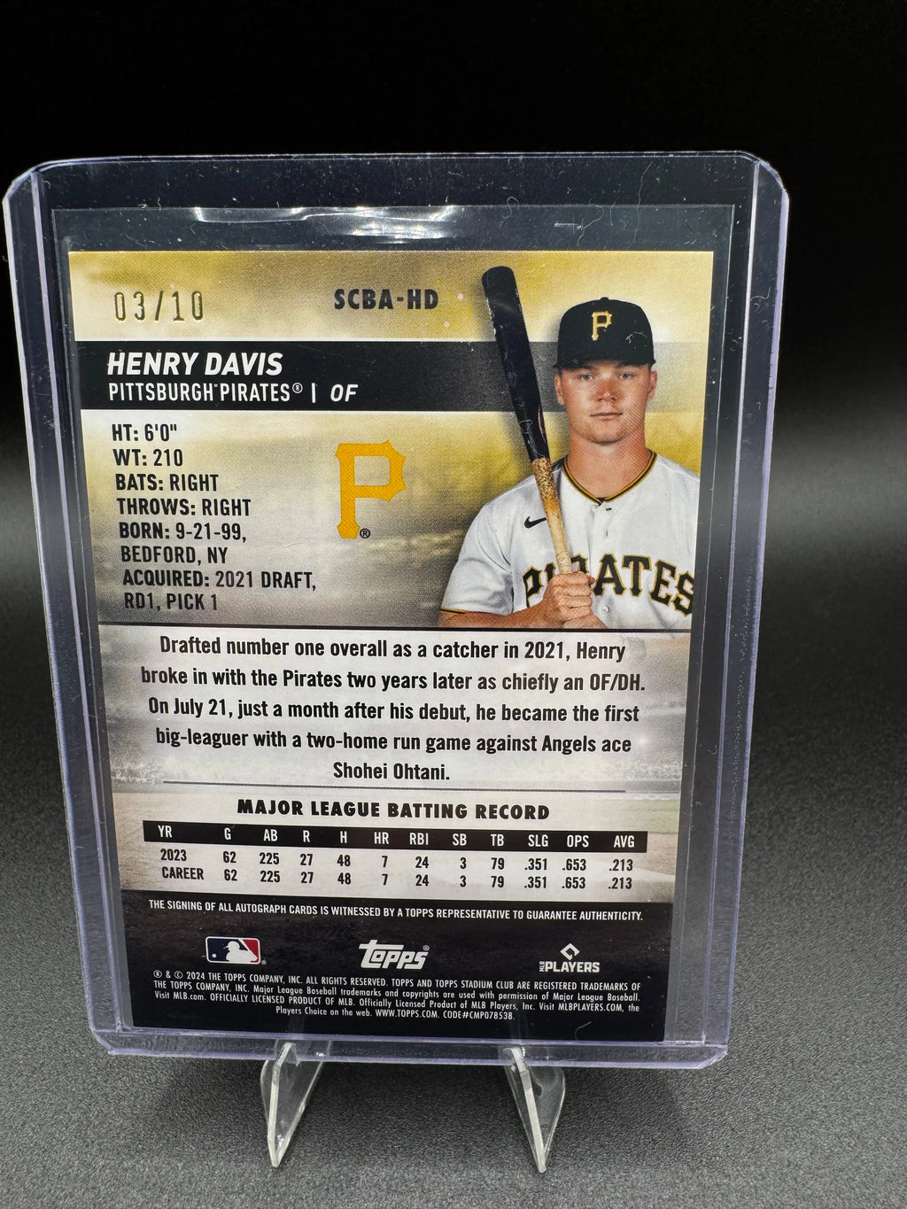 This 2024 Topps Stadium Club #SCBA-HD Henry Davis Auto card is an exceptional collectible, featuring a rare autograph and limited to just 10 copies worldwide. As the third card in this ultra-exclusive run, it highlights Henry Davis’s rookie season with the Pittsburgh Pirates, making it a prized addition for serious collectors and investors seeking high-value, scarce memorabilia.