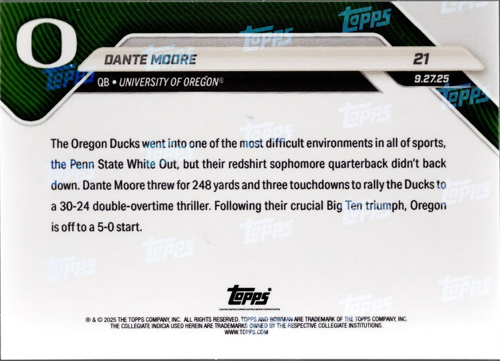 2025 Topps Bowman U Now Dante Moore #21 Black Foil /10 Oregon Ducks Rookie RC Football Card