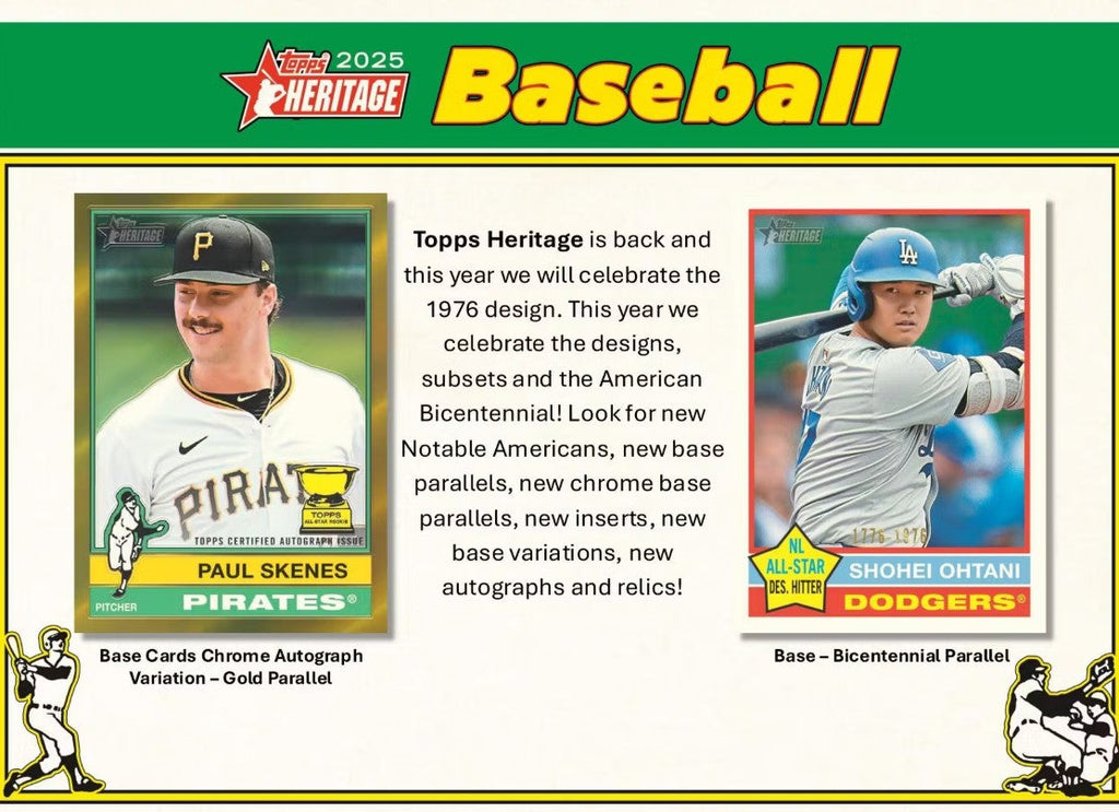 Topps Heritage is back and this year we will celebrate the 1976 design. This year we celebrate the designs, subsets and the American Bicentennial! Look for new Notable Americans, new base parallels, new chrome base parallels, new inserts, new base variations, new autographs and relics!