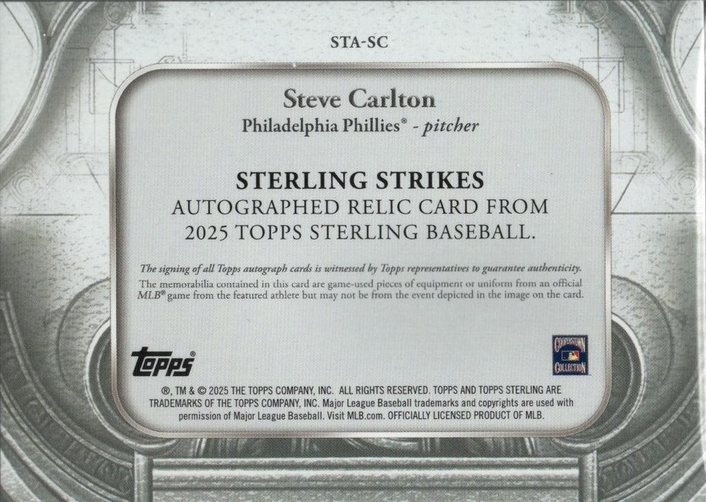 2025 Topps Sterling Steve Carlton #STASC Sterling Strikes Relic Auto /25 Philadelphia Phillies Baseball Card