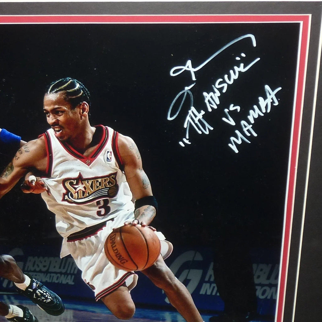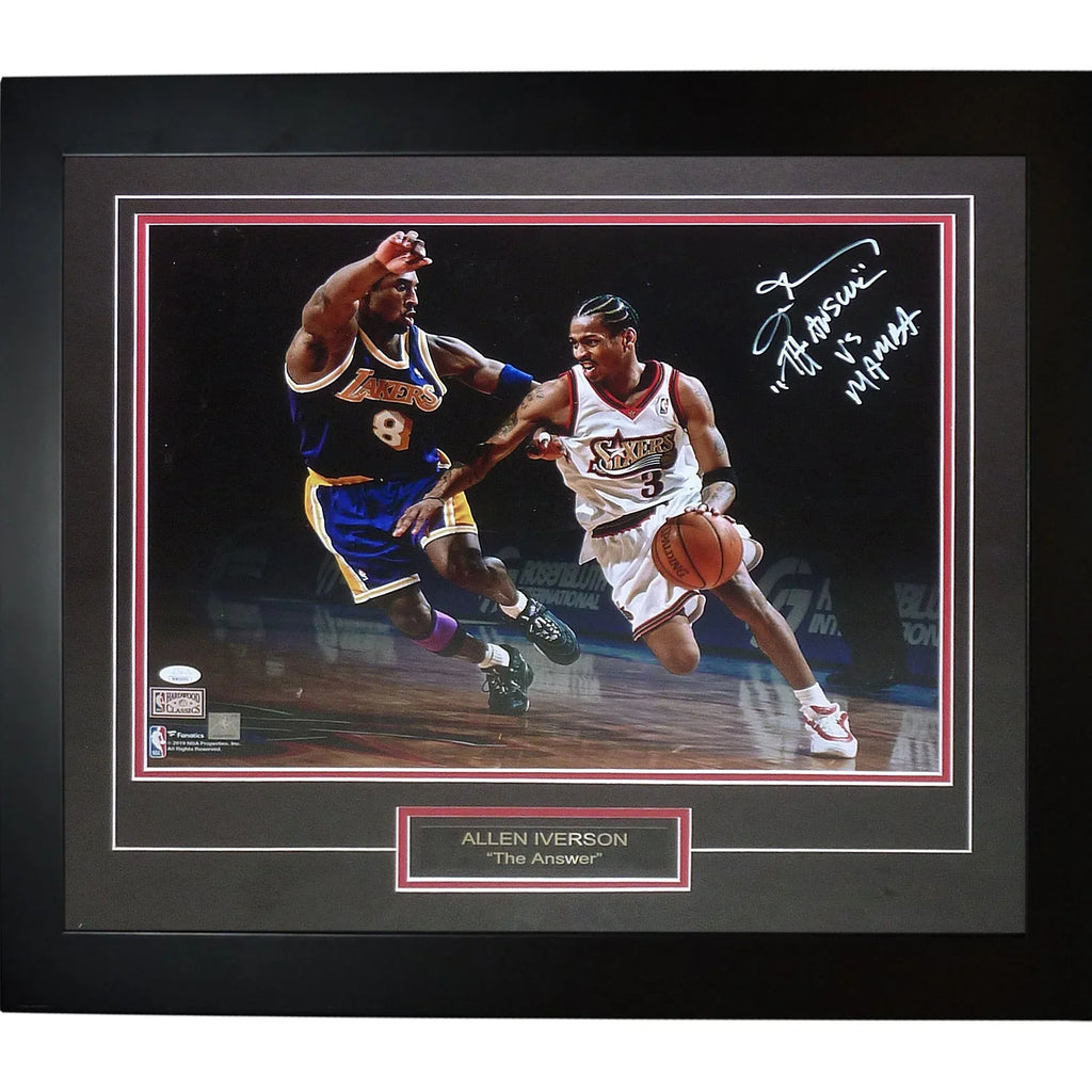 Relive the epic matchup between the iconic Allen Iverson and Kobe Bryant with this deluxe framed 16x20 photo! The Iverson autographed photo, certified by Beckett, captures the intensity and skill of both players. A must-have for any basketball fan and a perfect addition to any collection!