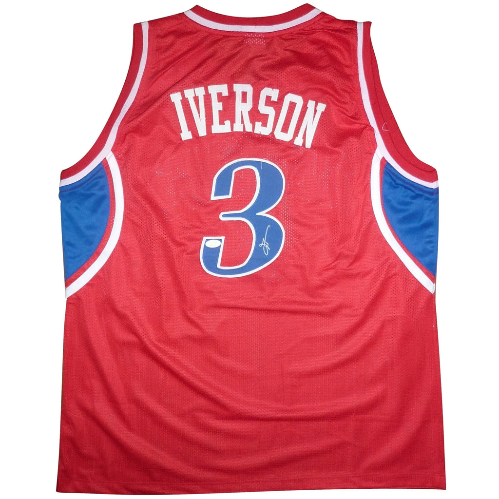 This stitched jersey was hand signed by Philadelphia 76ers Hall of Famer Allen Iverson at a private signing. It is accompanied by a Certificate of Authenticity from JSA. It is a pro-style custom stitched jersey with no Team logos or league markings. A tamper-evident hologram will be affixed to the item. Each signature is witnessed by a member of our staff or comes out of a private signing.