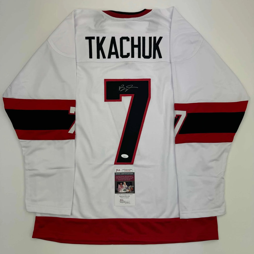 Autographed/Signed Brady Tkachuk Ottawa White Hockey Jersey JSA COA