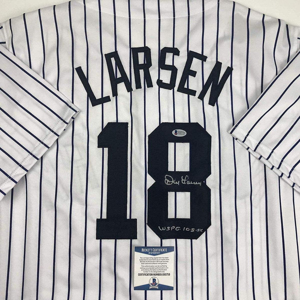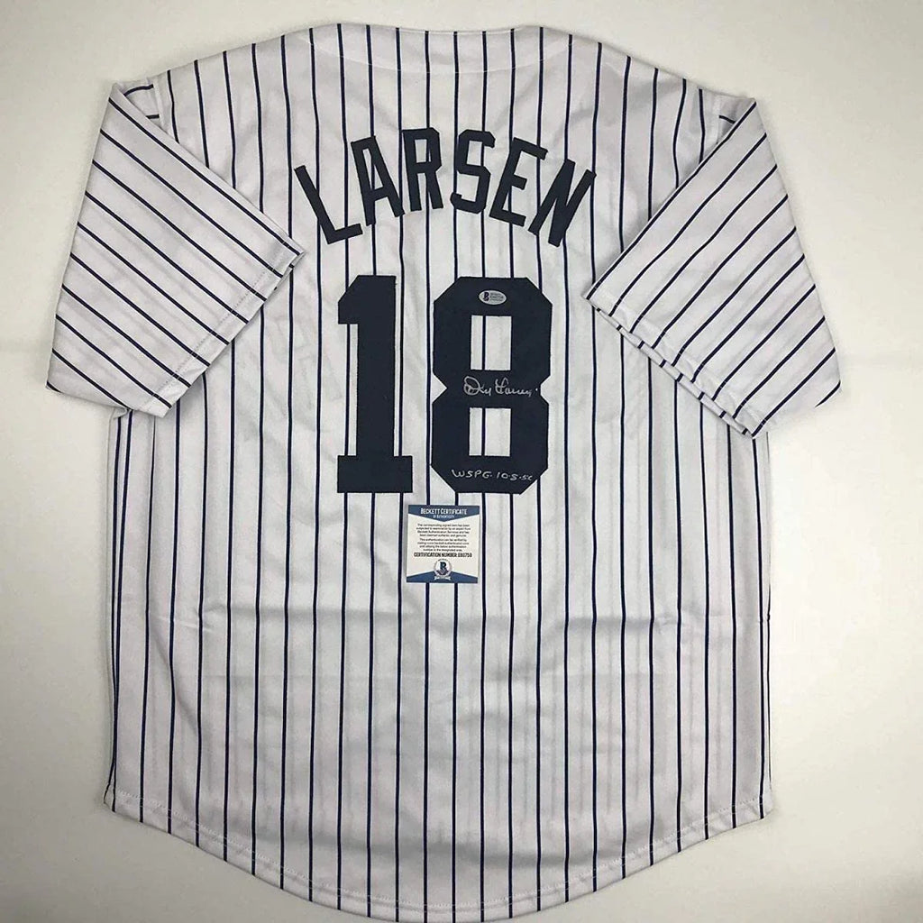 Autographed/Signed Don Larsen WS PG 10-8-56 New York Pinstripe Baseball Jersey Beckett BAS COA
