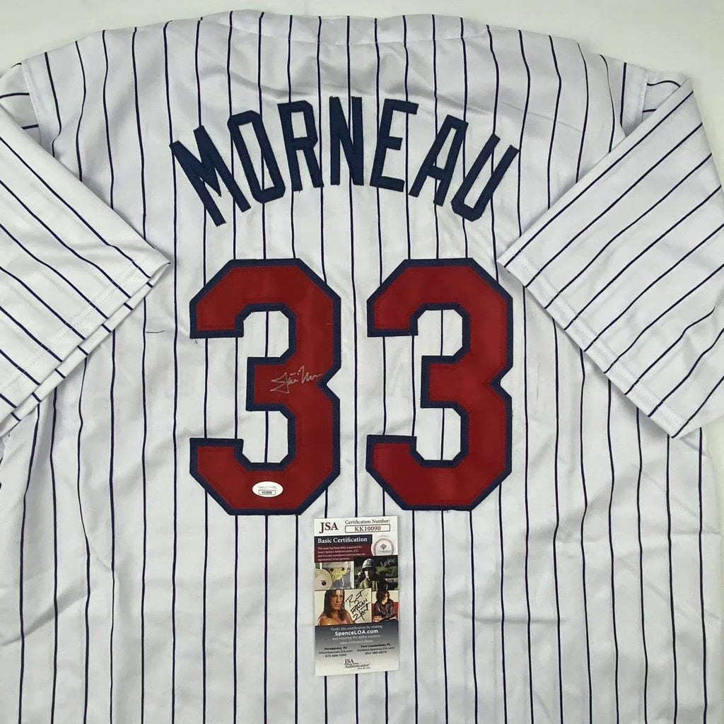 Autographed/Signed Justin Morneau Minnesota Pinstripe Baseball Jersey JSA COA
