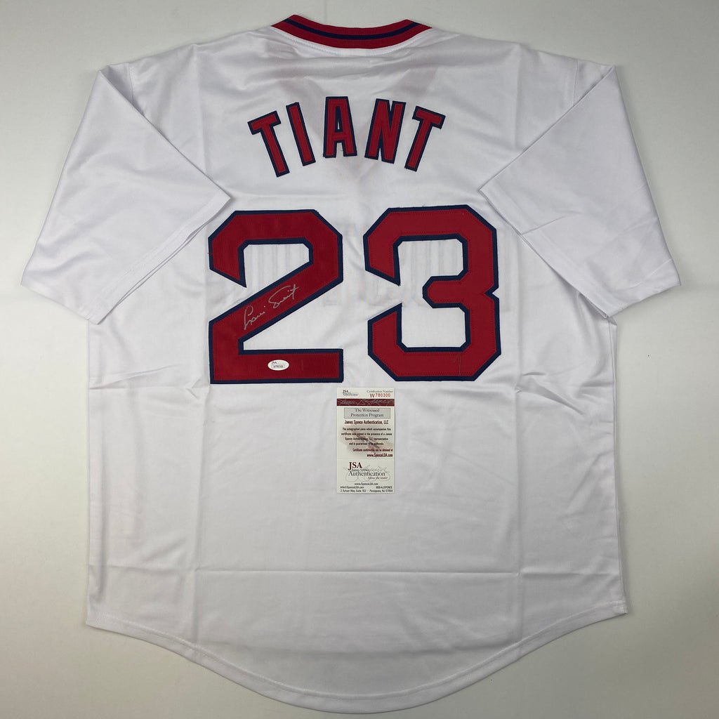 Autographed/Signed Luis Tiant Boston Red Sox White Baseball Jersey JSA COA