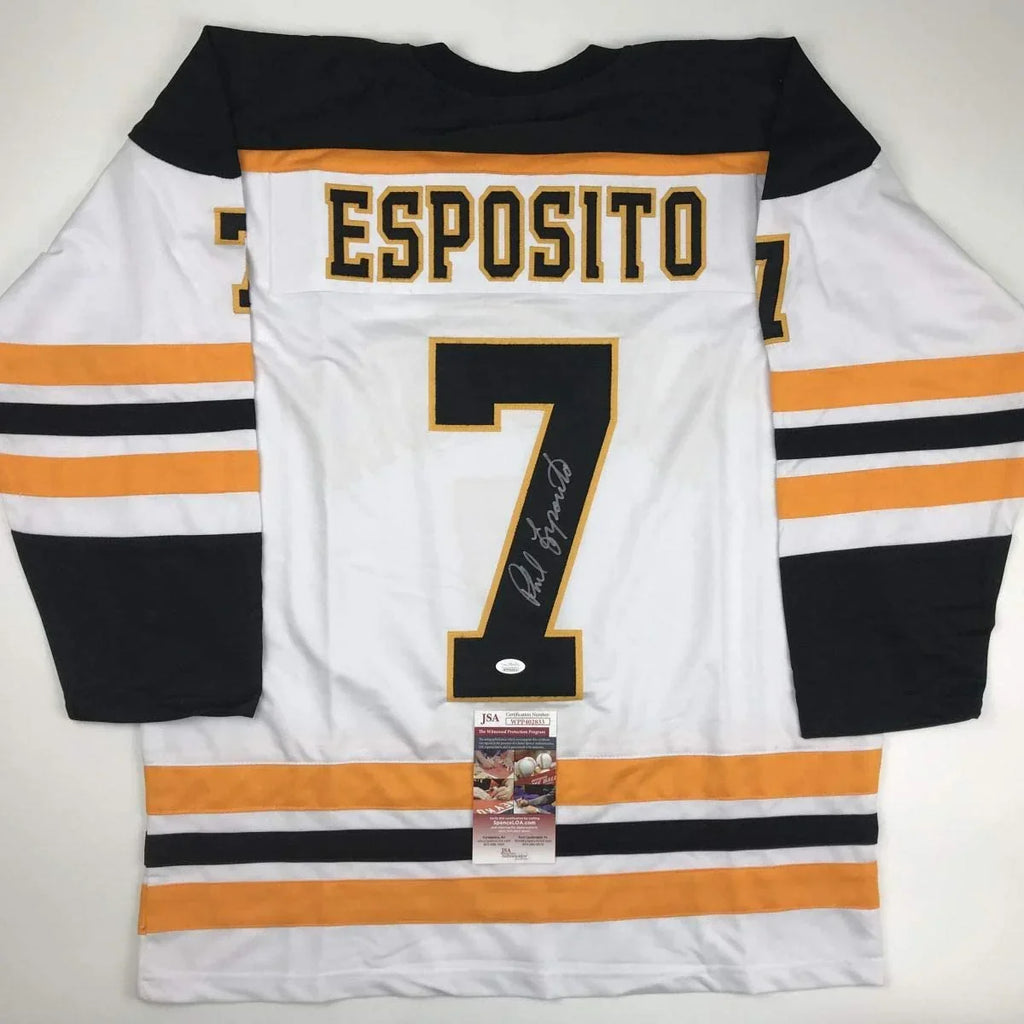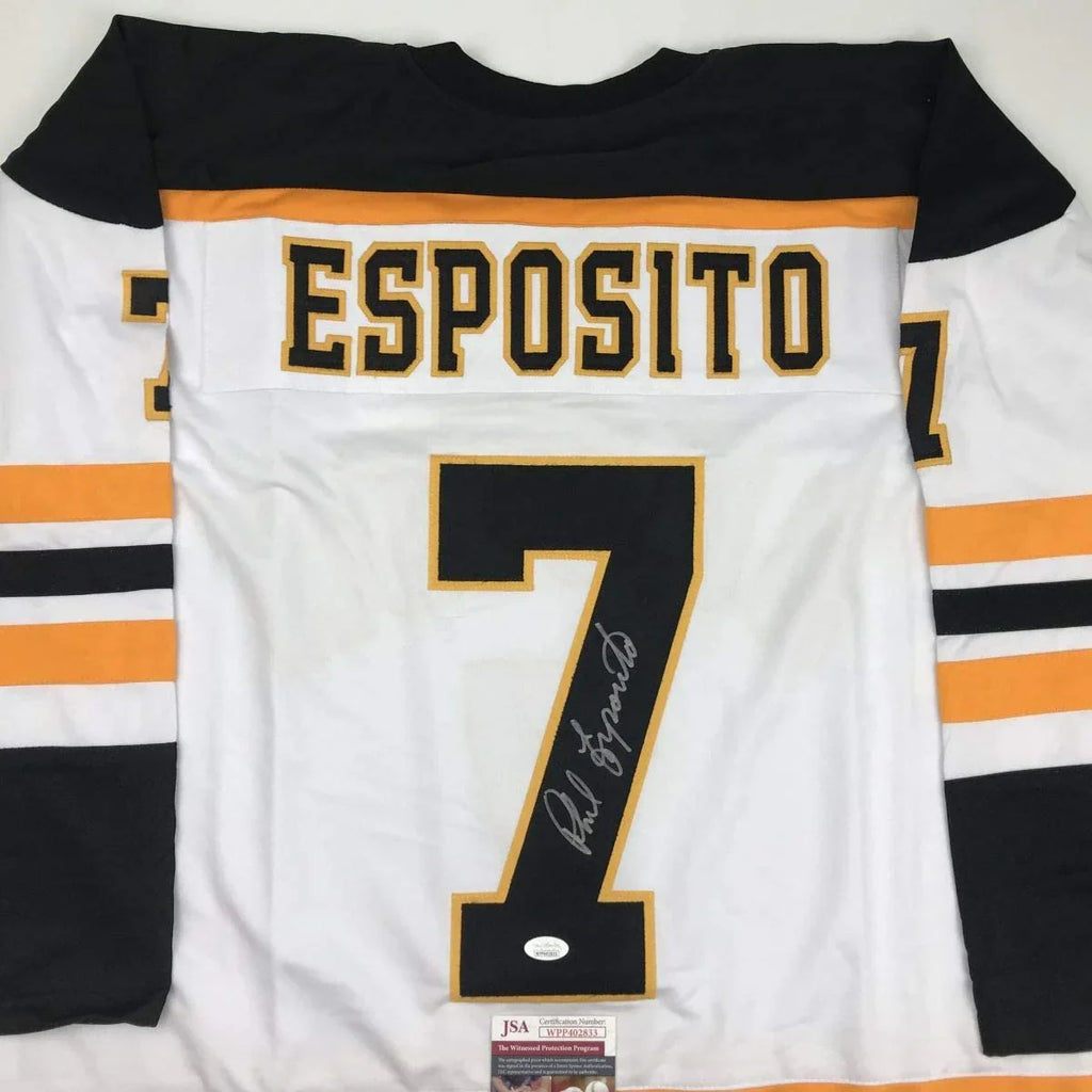 Autographed/Signed Phil Esposito Boston White Hockey Jersey JSA COA