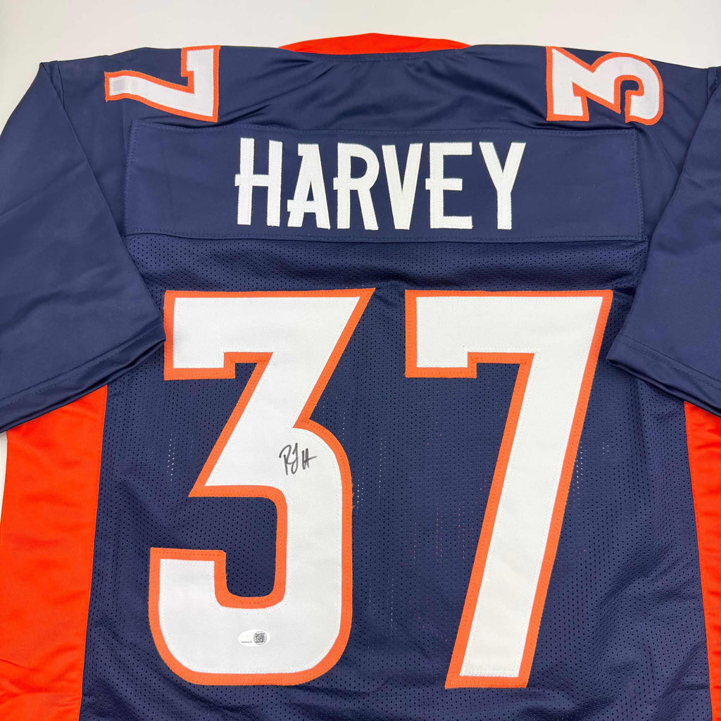Autographed/Signed R.J RJ Harvey Denver Blue Football Jersey JAS COA
