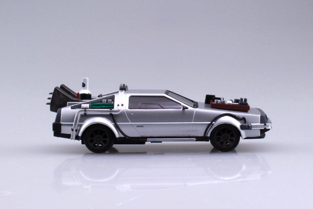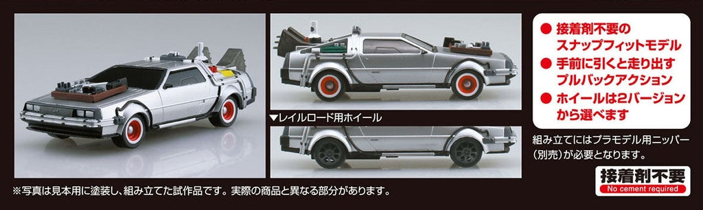 From Aoshima Bunka Kyozai Co. Easy to assemble, fast and easy to drive Time Machine! The time machine from the immortal classic "Back to the Future" is now available as a pull-back plastic model. With only a few parts, it is easy to build. Overall length: approx. 105 mm (1/43 scale) Pull-back spring included, so you can play with it even after assembly! Parts that appeared in each series title are included.