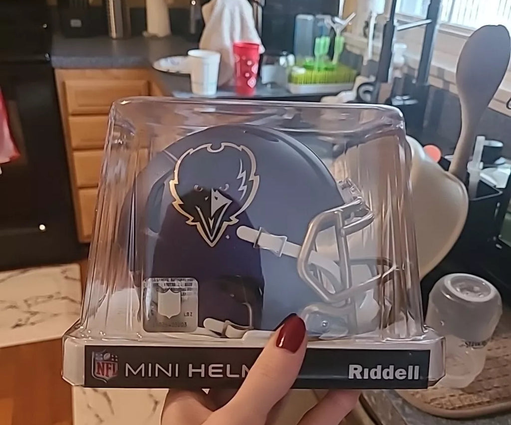 Baltimore Ravens Mini Speed Football Helmet. The ultimate NFL mini speed football helmet collectible, perfect NFL mini speed football helmets for autographs and collectors. Mini Speed Football Helmet with great graphics. Official NFL Mini Speed Football Helmet with official NFL team decal. ABS plastic Mini Speed Football Helmet shells with plastic facemask. Realistic interior foam padding, vinyl-leather chin strap. This is an affordable NFL football helmet for the true fan. Size: 1/2 scale versions of NFL football helmets. Size: 6"(L), 4½"(W), 5"(H) - (NOT FOR WEARING).