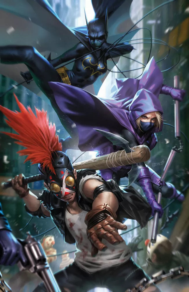 Gotham City is a battleground as The Joker takes over the Wayne fortune and wages a street war against the Dark Knight and his allies! Enter the “war zone” with short stories featuring characters like Cassandra Cain, Stephanie Brown, and Luke Fox and see how they’re fighting back in a city under siege! Also, the brutal full debut of the mysterious new anti-hero known as Clownhunter!