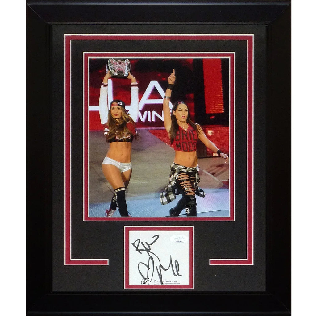 Own a piece of wrestling history with the Bella Twins Brie Bella and Nikki Bella Autographed WWE Wrestling “Signature Series” Frame! This JSA authenticated frame features the autographs of the famous wrestling sisters, making it a must-have for any fan. Display it proudly on your wall and show off your love and passion for the sport.
