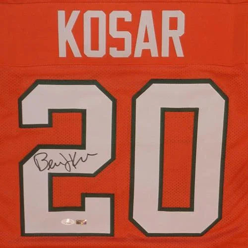 This stitched jersey was hand signed by former Miami Hurricanes quarterback Bernie Kosar at a private signing. It is accompanied by a Certificate of Authenticity from Palm Beach Autographs and JSA. A tamper-evident hologram will be affixed to the item. Each signature is witnessed by a member of our staff or comes out of a private signing.
