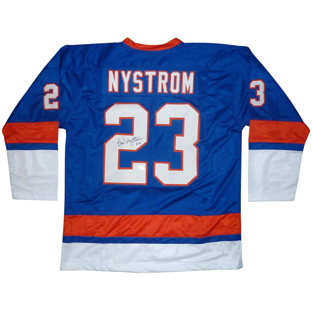 Elevate your sports collection with the Bobby Nystrom Autographed New York Custom Hockey Jersey! This jersey features a stunning blue design with Nystrom's iconic #23 along with his certified autograph from JSA. The perfect addition for any passionate hockey fan looking to showcase their love for the sport and this legendary player.