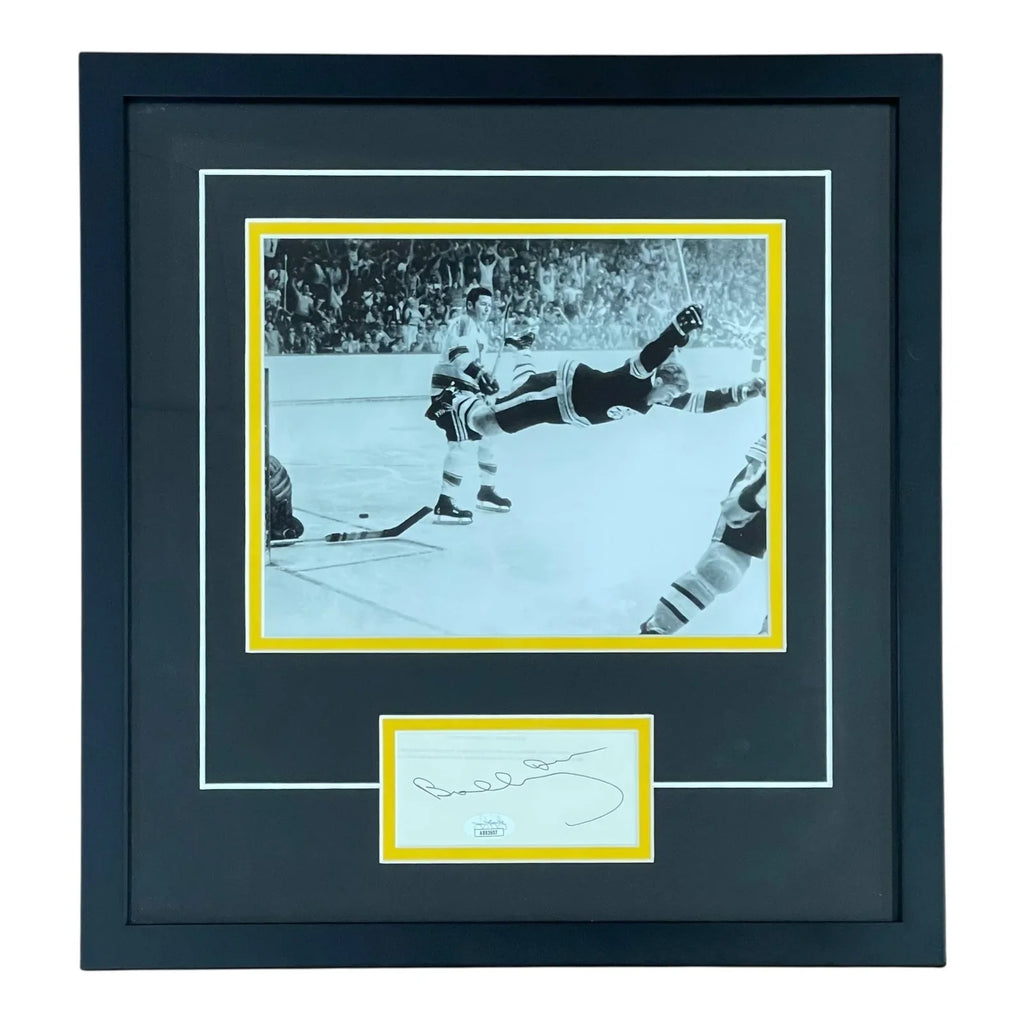 Own a piece of hockey history with the Bobby Orr Autographed Boston Bruins Photo "Signature Series" Frame! Featuring his iconic "Flying Goal" moment, this fully authenticated and framed photo showcases the talent and passion of the legendary Bobby Orr. Perfect for any Bruins fan or sports memorabilia collector. Limited quantities available!