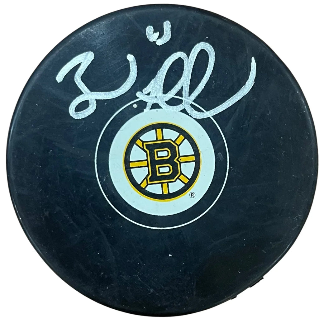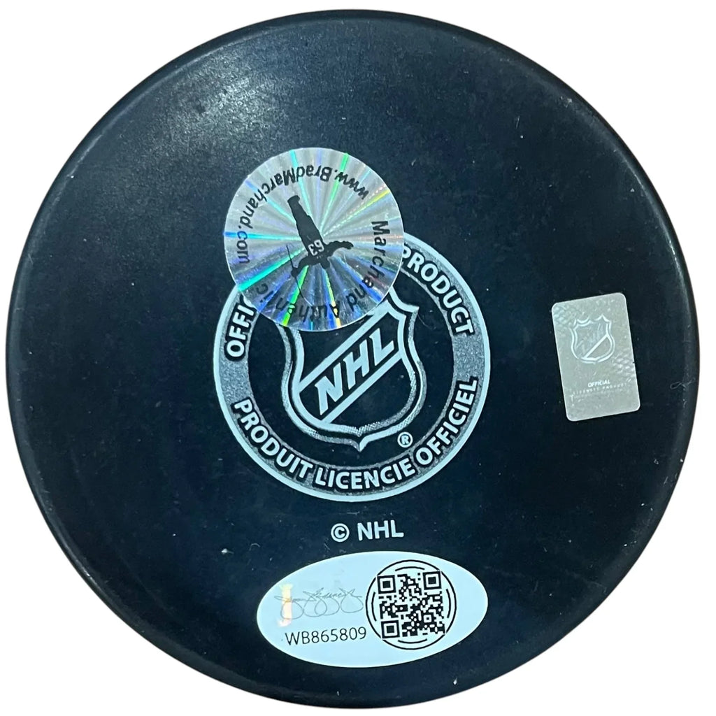 This Boston Bruins hockey puck was hand signed by star Brad Marchand at a private signing. It is accompanied by a Certificate of Authenticity from JSA and the official Brad Marchand hologram. A tamper-evident hologram will be affixed to the item.