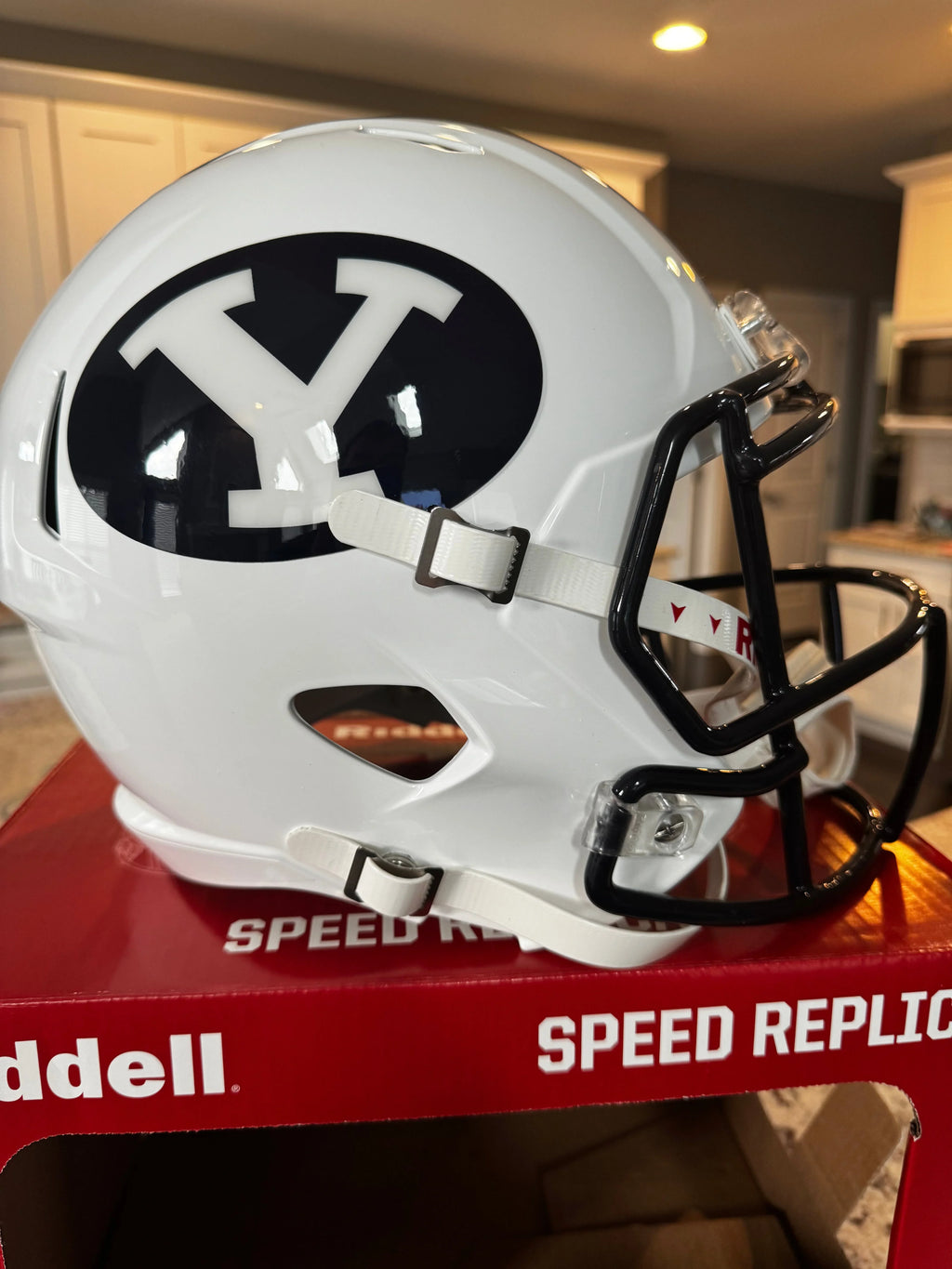 Brigham Young Cougars Full Size Speed Replica NCAA Helmet by Riddell. This full size BYU helmet is designed with a non-wear plate and molded foam jaw pads. a steel polyvinyl-coated face mask, 4-pt chin strap, and elliptical air vents. This officially licensed NCAA helmet is great for autographs and features BYU team logo decals on both sides. The striking shape of the future. NCAA BYU Replica Speed helmet size medium measures: 12.75"(L), 9.25"(W), 9.75"(H). NCAA Brigham Young Cougars Full Size Speed Replica Helmet. (NOT FOR WEARING