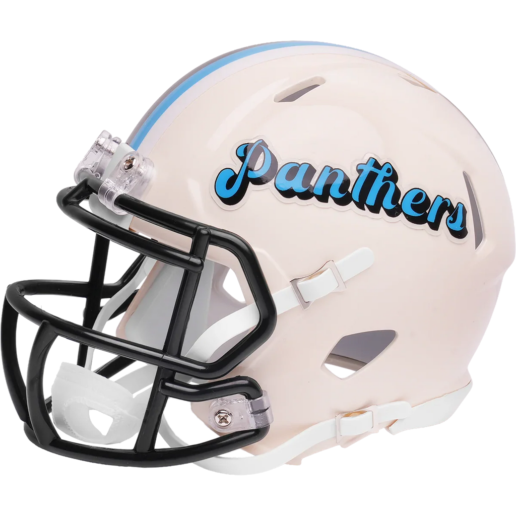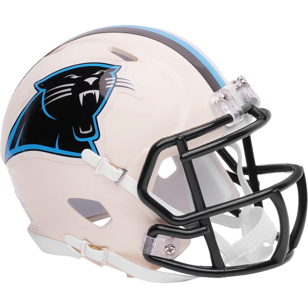 Carolina Panthers Speed Mini Football Helmet. Our new, distinctively fresh, yet familiar alternate helmet collection adds a colorful twist to your favorite NFL team helmet. Retro Alternates utilize different color schemes for the shells and facemasks with a unique paint technique that gives the colors a distinctive glow. Official NFL mini football helmet with official NFL team decals. ABS plastic mini football helmet shells with plastic facemask. Realistic interior foam padding, vinyl-leather chin strap. A must-have addition to any collection! Size: 1/2 scale versions of NFL football helmets. Size: 6"(L), 4 ½"(W), 5"(H) - (NOT FOR WEARING).
