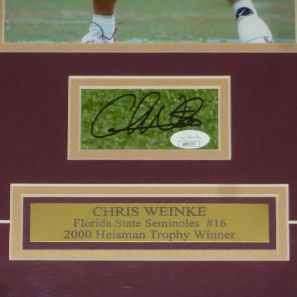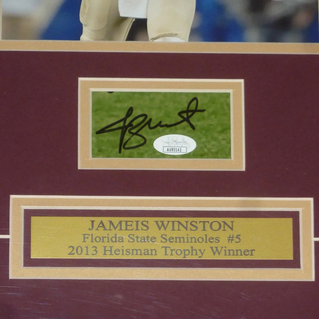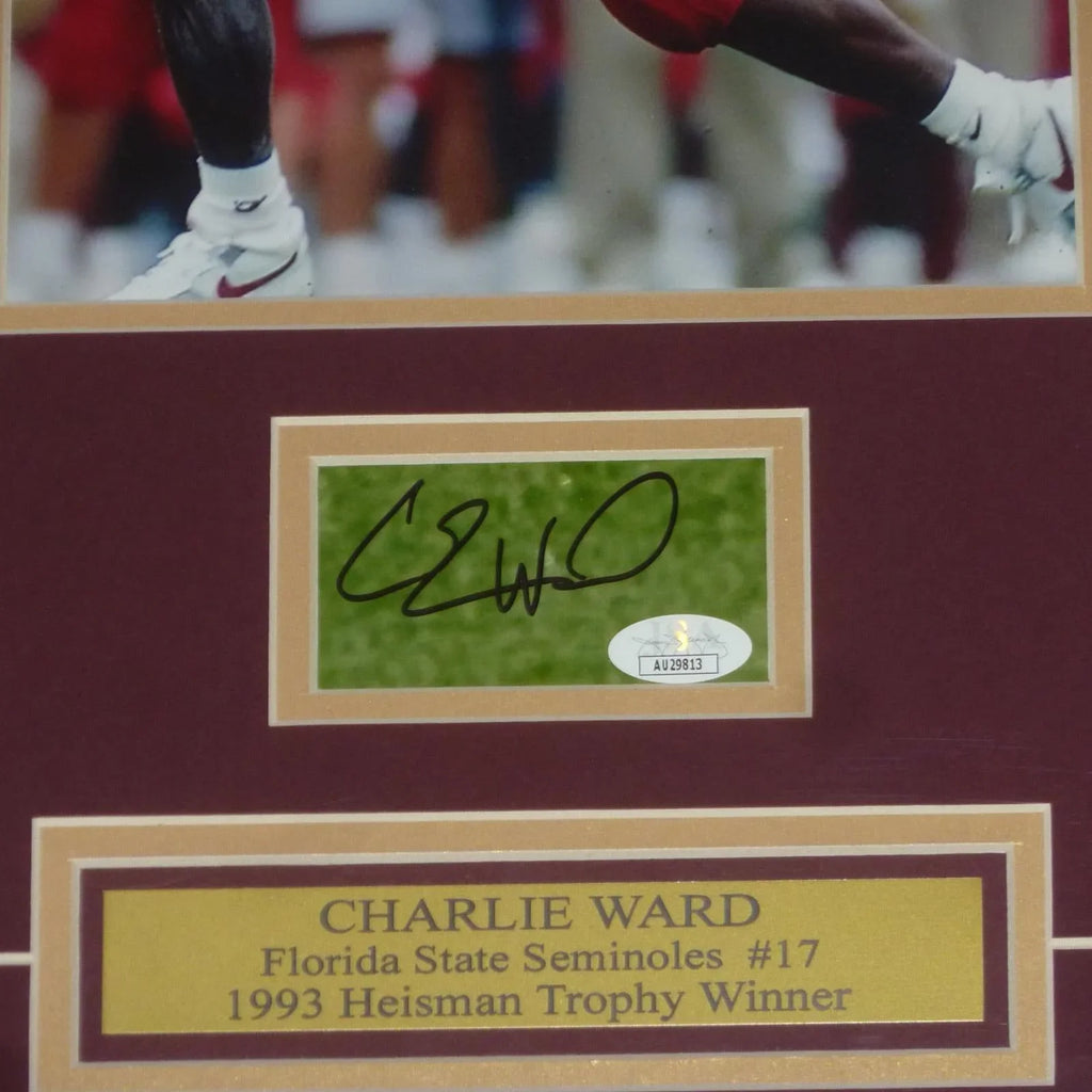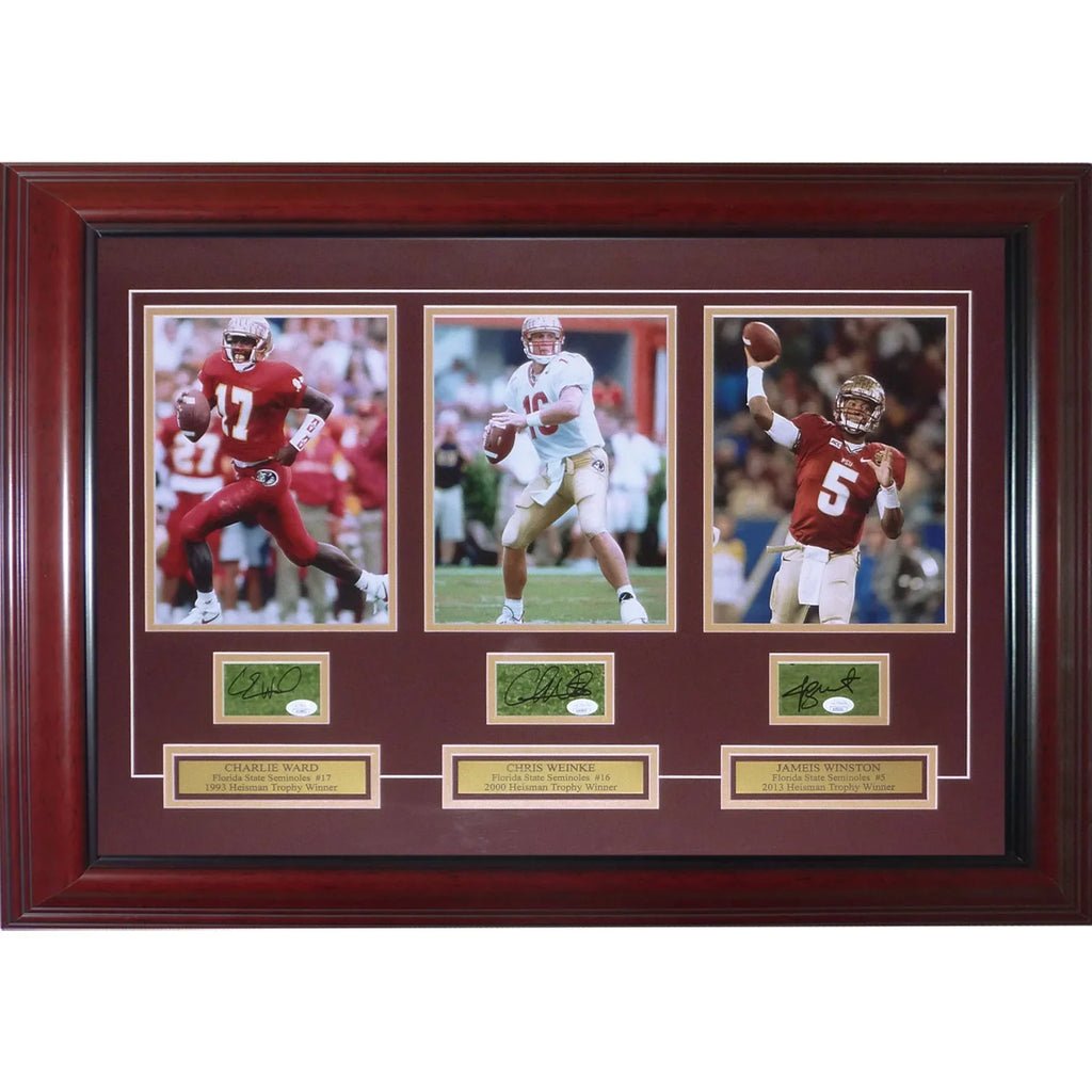 Capture the magic of Florida State Seminoles with this deluxe framed triple Heisman piece! As a fan, you know the significance of having the autographs of Charlie Ward, Chris Weinke, and Jameis Winston all in one place. And with JSA certification, this is more than just a collectible - it's a piece of history that you can proudly display in your home or office. Don't miss out on this special opportunity to own a true collector's item.