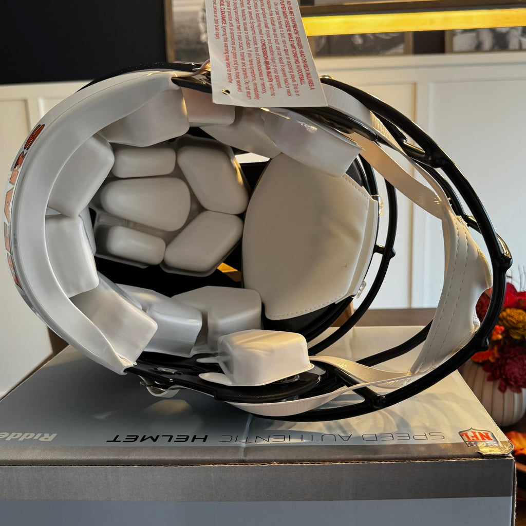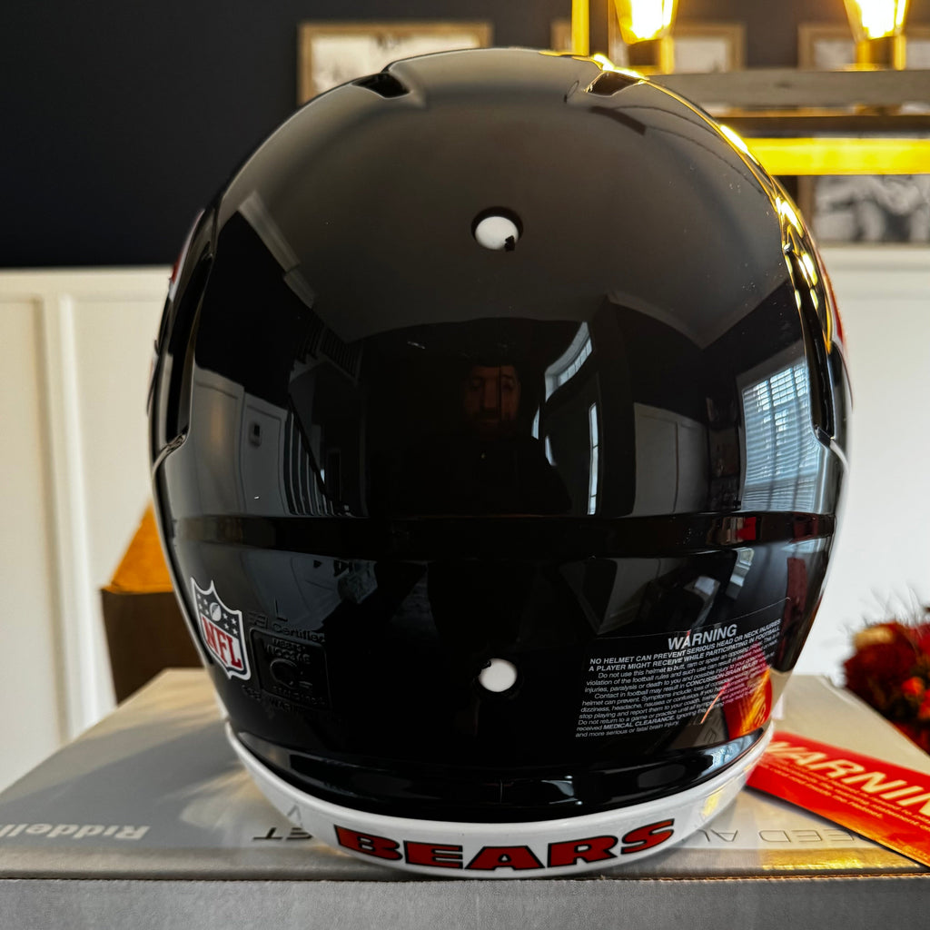 Chicago Bears Full Size Authentic Revolution Speed NFL Helmet by Riddell. This full size Bears helmet is designed with extended mandible (jaw area) protection, a steel polyvinyl-coated face mask, chin strap, increased padding, an integrated facemask attachment system and elliptical air vents. NFL Team name on back bumper (except Chiefs, Steelers and Giants). The officially licensed Chicago Bears helmet is great for autographs and features Bears team logo decals on both sides. The striking shape of the future. NFL Bears Authentic Revolution Speed helmet size is 13.5"(L) x 9.75"(W) x 10.25"(H). NFL Chicago Bears Full Size Helmet.