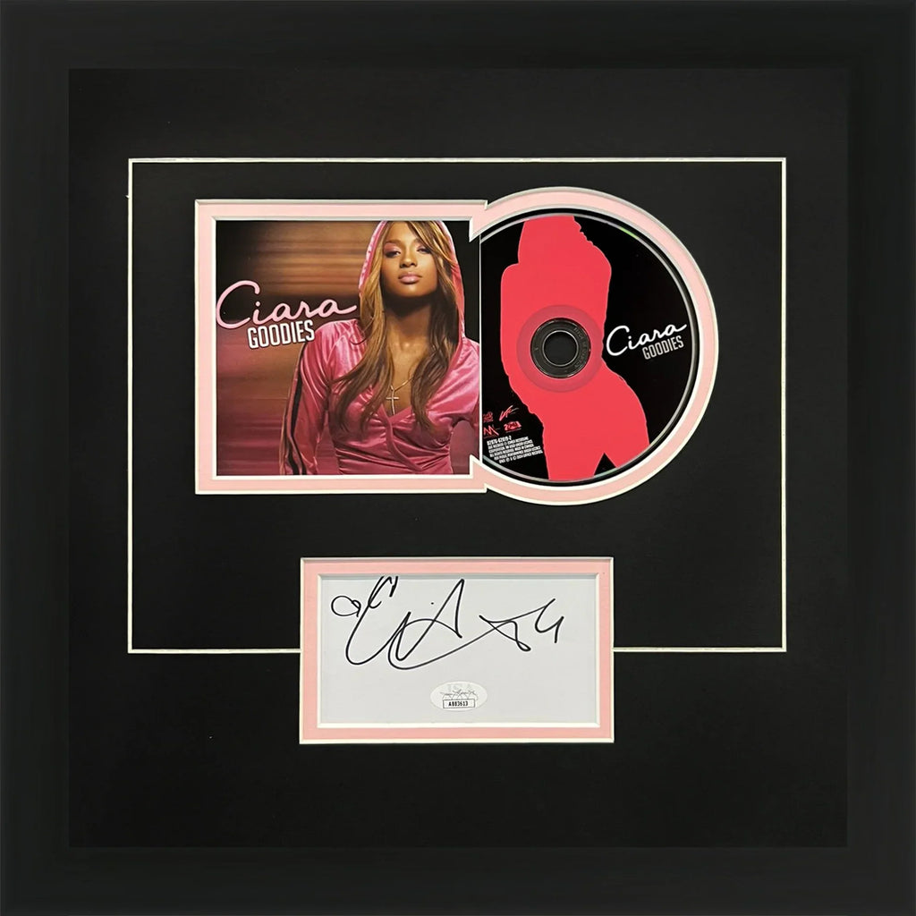 This frame features a hand signed signature of singer Ciara and was deluxe framed with an Goodies CD. It is accompanied by a Certificate of Authenticity from JSA. A tamper-evident hologram will be affixed to the item.