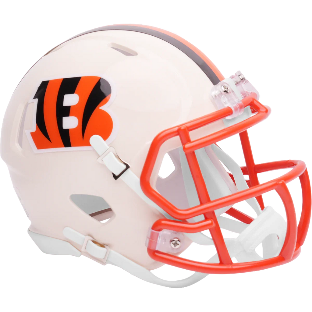Cincinnati Bengals Speed Mini Football Helmet. Our new, distinctively fresh, yet familiar alternate helmet collection adds a colorful twist to your favorite NFL team helmet. Retro Alternates utilize different color schemes for the shells and facemasks with a unique paint technique that gives the colors a distinctive glow. Official NFL mini football helmet with official NFL team decals. ABS plastic mini football helmet shells with plastic facemask. Realistic interior foam padding, vinyl-leather chin strap. A must-have addition to any collection! Size: 1/2 scale versions of NFL football helmets. Size: 6"(L), 4 ½"(W), 5"(H) - (NOT FOR WEARING).