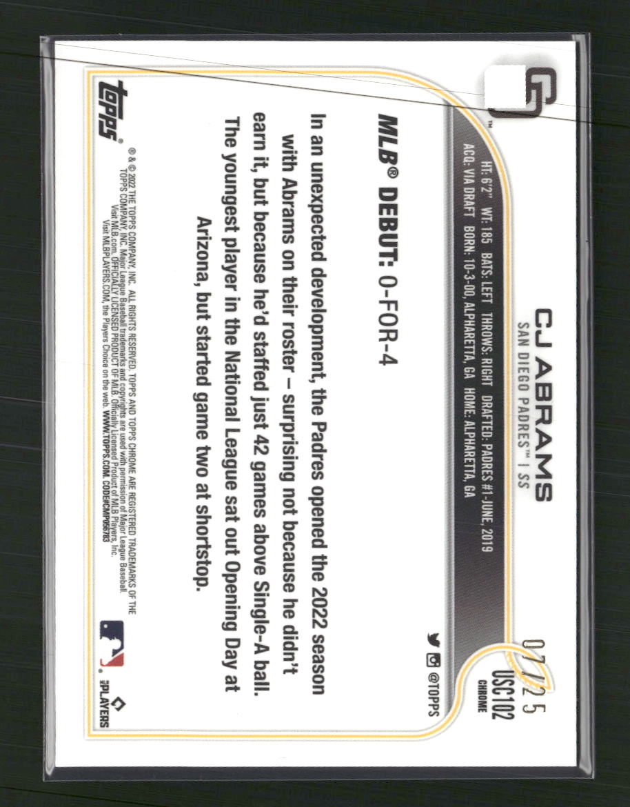 Card Number: USC102 Category: Collectible Trading Cards Condition: Near mint or better Set: 2022 Topps Chrome Update Type: Sports Trading Card Year: 2022