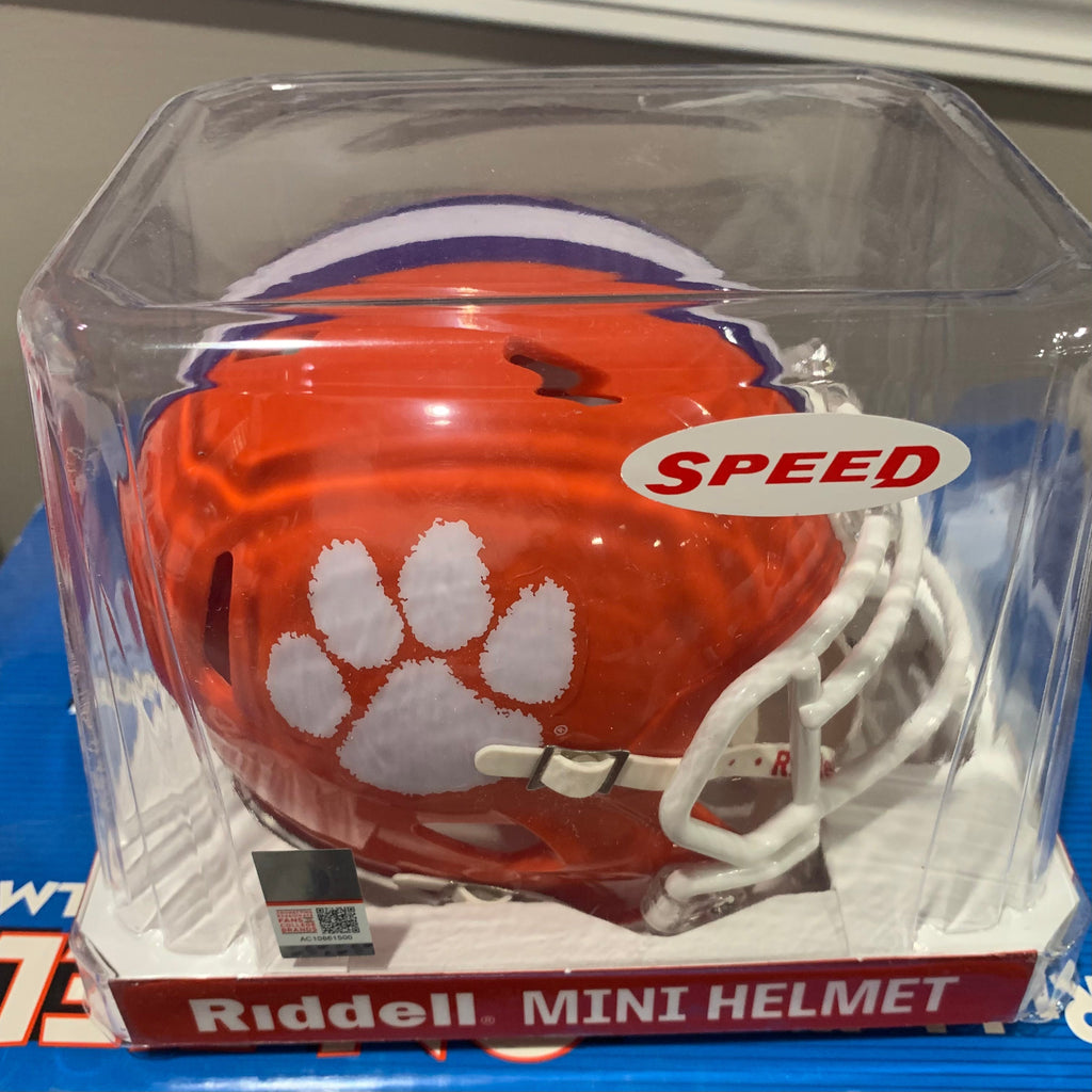 Clemson Tigers Mini Speed College Football Helmet. The ultimate NCAA College mini speed football helmet collectible, perfect NCAA mini speed football helmets for autographs and collectors. Mini Speed Football Helmet with great graphics. Official NCAA Mini Speed Football Helmet with official NCAA team decal. ABS plastic Mini Speed Football Helmet shells with plastic facemask. Realistic interior foam padding, vinyl-leather chin strap. This is an affordable NCAA football helmet for the true fan. Size: 1/2 scale versions of NCAA football helmets. Size: 6"(L), 4½"(W), 5"(H) - (NOT FOR WEARING).