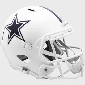 Dallas Cowboys Full Size Speed Replica NFL Helmet by Riddell. This full size Dallas Cowboys helmet is designed with a non-wear plate and molded foam jaw pads. a steel polyvinyl-coated face mask, 4-pt chin strap, and elliptical air vents. NFL Team name on back bumper (except Chiefs, Steelers and Giants). The officially licensed NFL helmet is great for autographs and features Cowboys team logo decals on both sides. The striking shape of the future. NFL Dallas Cowboys Replica Speed helmet size medium measures: 12.75"(L), 9.25"(W), 9.75"(H). NFL Dallas Cowboys Full Size Speed Replica Helmet. (NOT FOR WEARING)