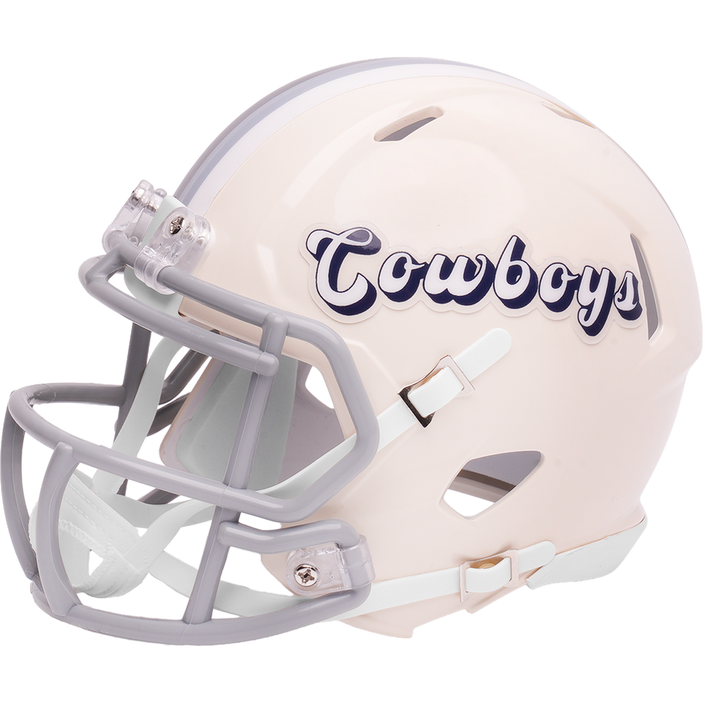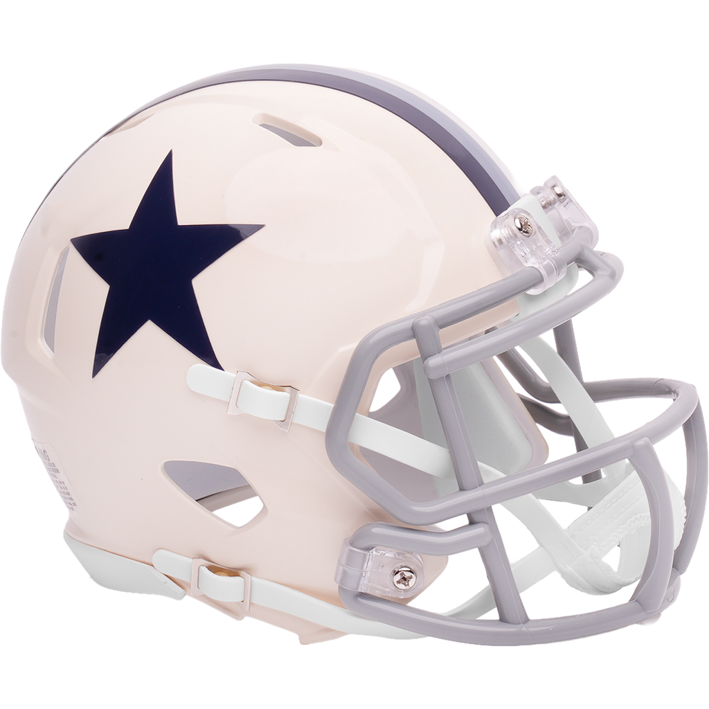 Dallas Cowboys Speed Mini Football Helmet. Our new, distinctively fresh, yet familiar alternate helmet collection adds a colorful twist to your favorite NFL team helmet. Retro Alternates utilize different color schemes for the shells and facemasks with a unique paint technique that gives the colors a distinctive glow. Official NFL mini football helmet with official NFL team decals. ABS plastic mini football helmet shells with plastic facemask. Realistic interior foam padding, vinyl-leather chin strap. A must-have addition to any collection! Size: 1/2 scale versions of NFL football helmets. Size: 6"(L), 4 ½"(W), 5"(H) - (NOT FOR WEARING).