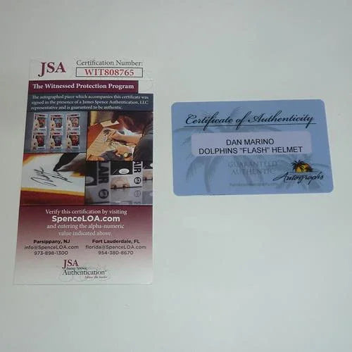 Own a piece of history with this Dan Marino autographed Miami Dolphins Flash Alternate deluxe full-size replica helmet. Show off your team spirit with this helmet, signed by the legendary quarterback himself. With the JSA Witness certification, you can be sure of the authenticity of this collectible item.