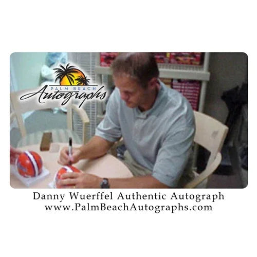 This authentic mini helmet, signed by Heisman Trophy winner Danny Wuerffel, is a must-have for any Florida Gators fan. With the added "96 Heisman" inscription, you can proudly display your team spirit and commemorate one of the greatest players in Gators history. A true collector's item. Each signature is witnessed by a member of our staff or comes out of a private signing.