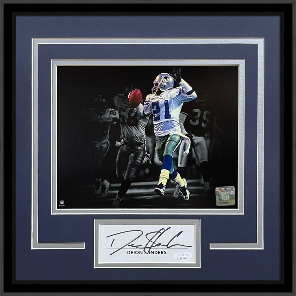 Own a piece of history with the Deion Sanders Autographed Dallas Cowboys "Signature Series" Frame. This beautiful frame features an authentic autographed photo of the legendary Deion Sanders in his iconic Dallas Cowboys uniform. Certified by JSA, this frame is a must-have for any true fan.