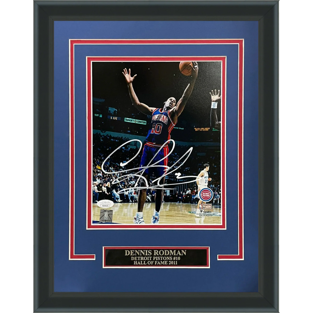 Experience the thrill of owning an authentic piece of sports history with our Dennis Rodman Autographed Detroit Pistons Deluxe Framed 8x10 Photo. Each photo is personally autographed and certified by JSA, ensuring its quality and authenticity. Display it proudly in your home or office and relive the excitement of the Detroit Pistons glory days with every glance.