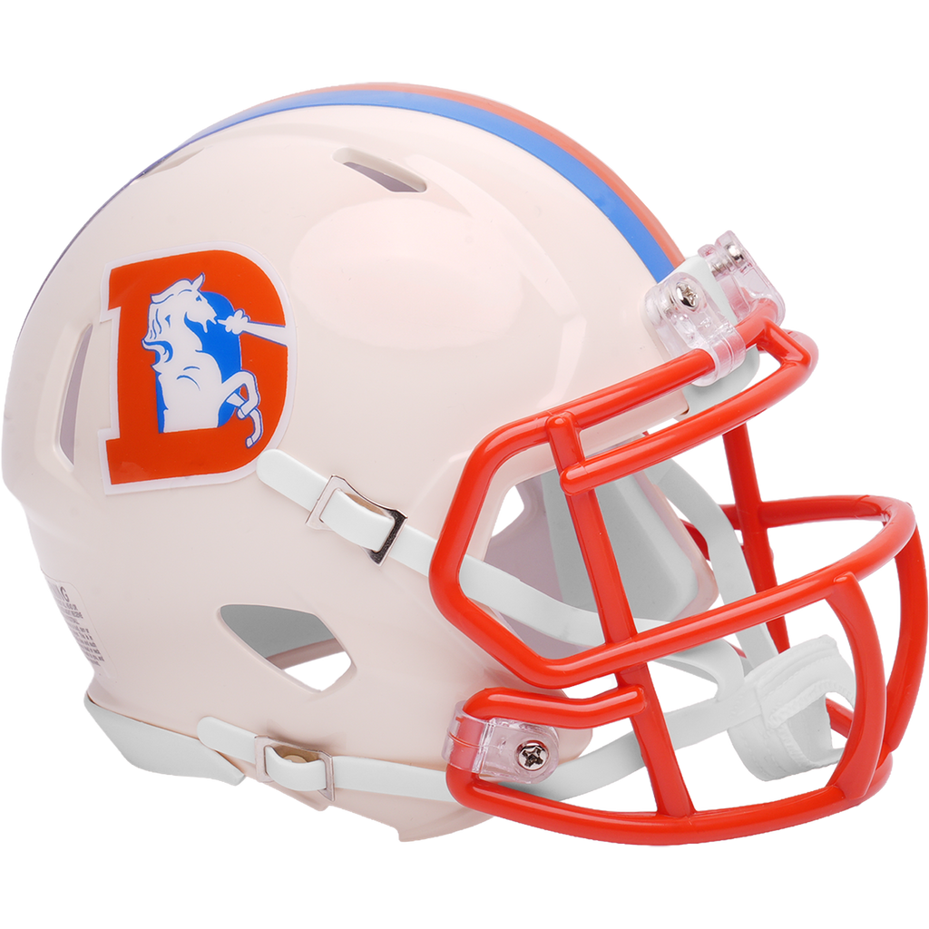 Denver Broncos Speed Mini Football Helmet. Our new, distinctively fresh, yet familiar alternate helmet collection adds a colorful twist to your favorite NFL team helmet. Retro Alternates utilize different color schemes for the shells and facemasks with a unique paint technique that gives the colors a distinctive glow. Official NFL mini football helmet with official NFL team decals. ABS plastic mini football helmet shells with plastic facemask. Realistic interior foam padding, vinyl-leather chin strap. A must-have addition to any collection! Size: 1/2 scale versions of NFL football helmets. Size: 6"(L), 4 ½"(W), 5"(H) - (NOT FOR WEARING).