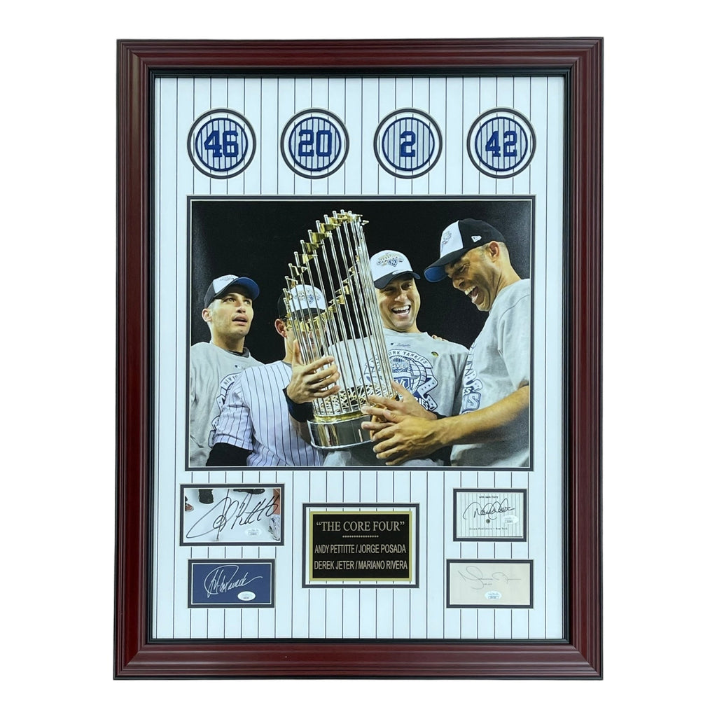Own a piece of history with this Deluxe Framed Cut Piece featuring autographs from the legendary New York Yankees "Core Four": Derek Jeter, Andy Pettitte, Jorge Posada, and Mariano Rivera. This piece also includes patches from their championship years and is authenticated by JSA, making it a must-have for any die-hard fan. Don't miss out on this truly special collectible!