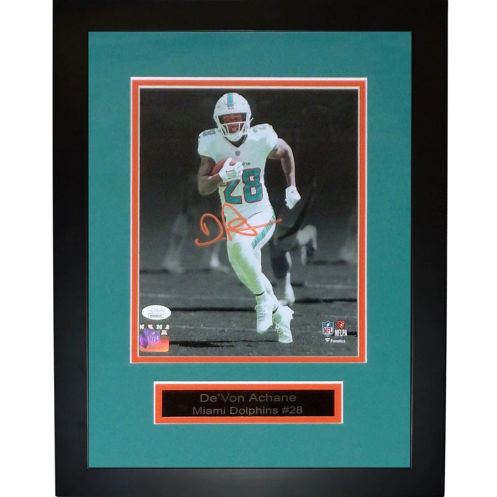 This autographed 8x10 photo of De'Von Achane in a Miami Dolphins spotlight is a must-have for any football fan. Show off your team spirit with this deluxe framed piece, guaranteed to be authentic by JSA. A perfect addition to any collection and a unique gift for any Dolphins fan!
