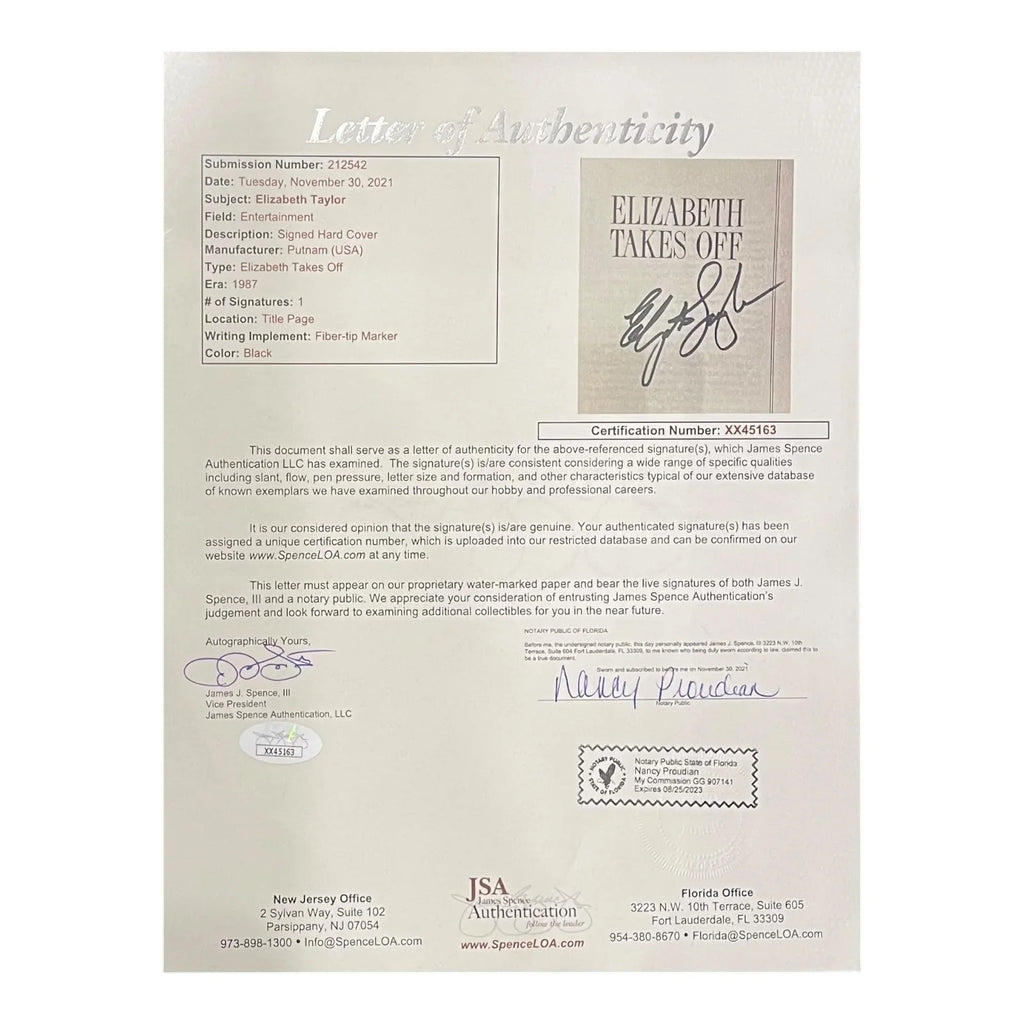 Own a piece of Hollywood history with this Elizabeth Taylor autographed copy of "Elizabeth Takes Off" book. Authenticated with a JSA Letter of Authenticity, this rare collectible showcases the signature of one of cinema's most iconic stars. Perfect for film enthusiasts, autograph collectors, or fans of the legendary actress, this signed memoir offers both investment value and a tangible connection to Taylor's extraordinary legacy.