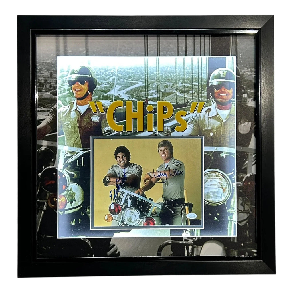 Looking for the ultimate addition to your entertainment collection? Look no further than this deluxe framed CHiPs 8x10 photo signed by stars Erik Estrada and Larry Wilcox! Certified by JSA, this collectible piece is a must-have for any fan of the iconic '70s cop duo.