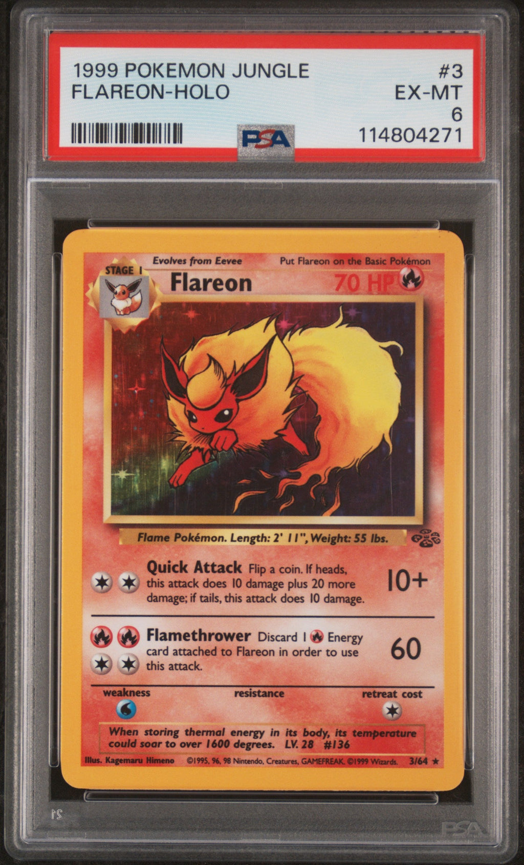 Card Number: 3 Category: Collectible Trading Cards Condition: Excellent-Mint Player/Character: Flareon-Holo Set: 1999 Pokemon Jungle Type: Collectible Card Game Year: 1999 Game: Tcg Grade: PSA 6 Certification #: 114804271